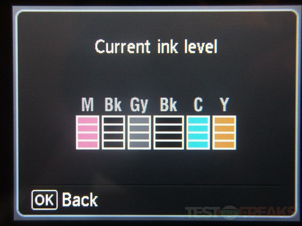 The ink cartridges are magenta, yellow, cyan, gray, black and a double black.
