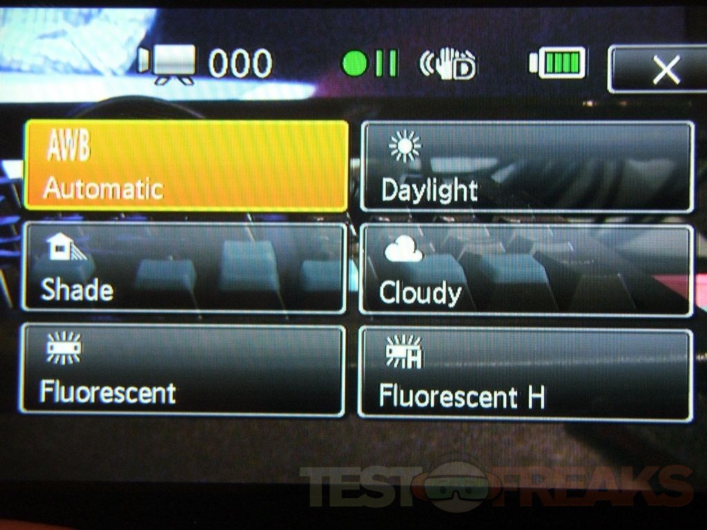 White Balance: Auto, Daylight, Shade, Cloudy, Tungsten, Fluorescent, Fluorescent H, Manual