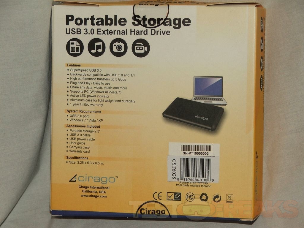 The enclosure is actually very nice, it’s aluminum so it’s tough and should help keep the drive cool. The Cirago logo is on the front and nothing is on the back. It’s a 2.5” drive so it’s small and portable.