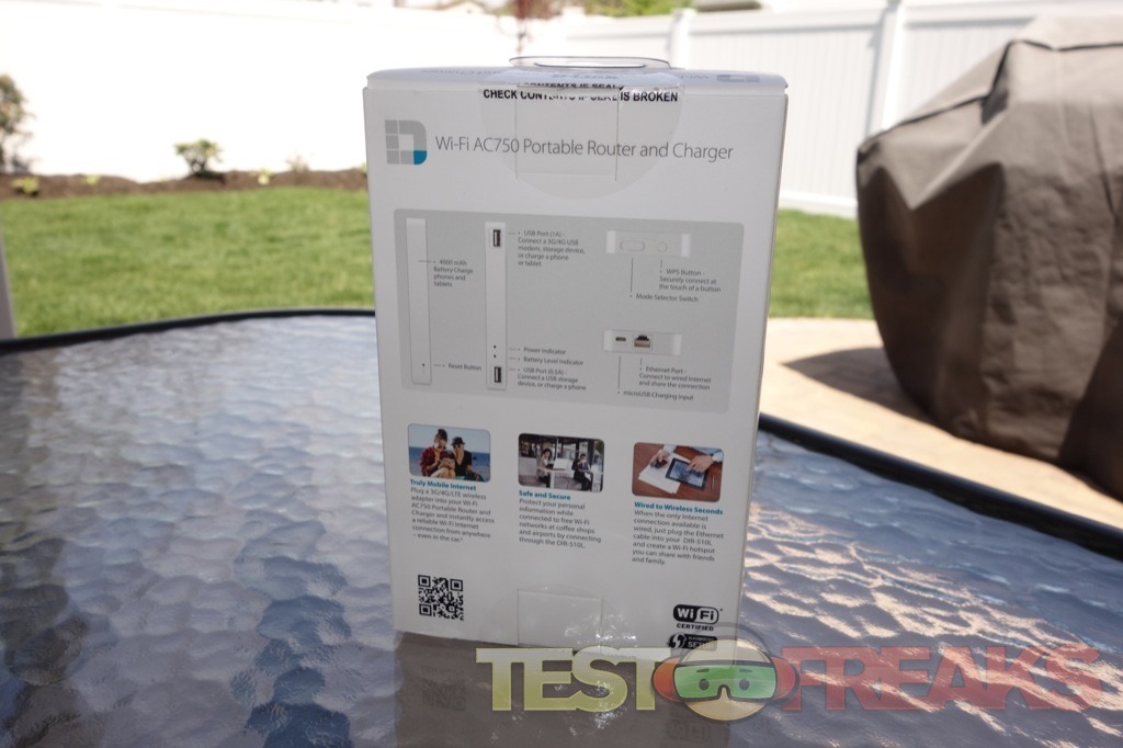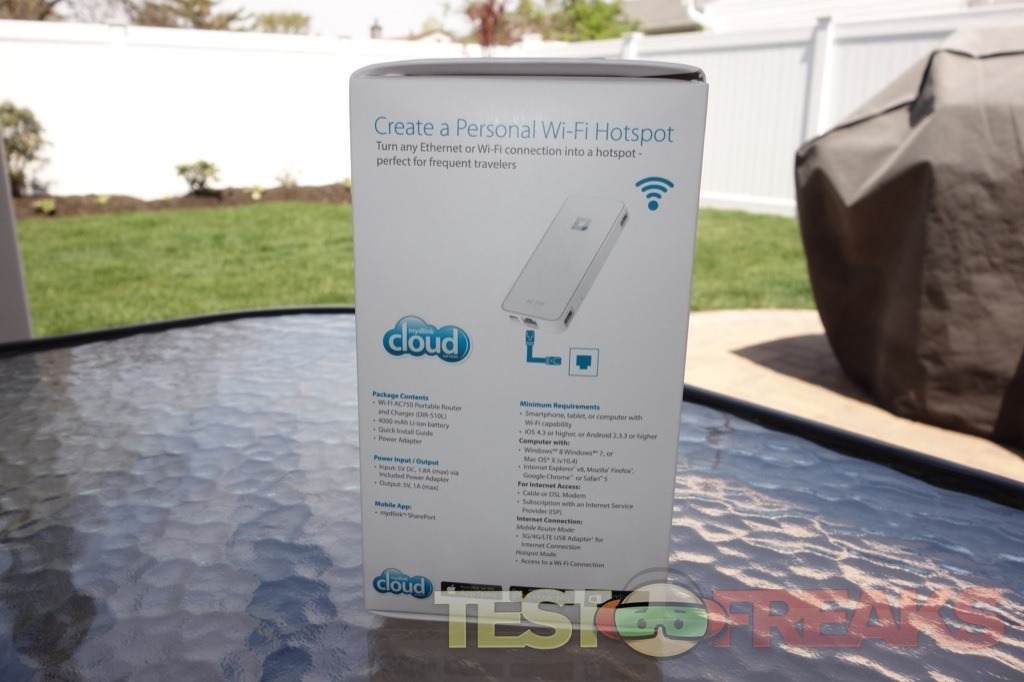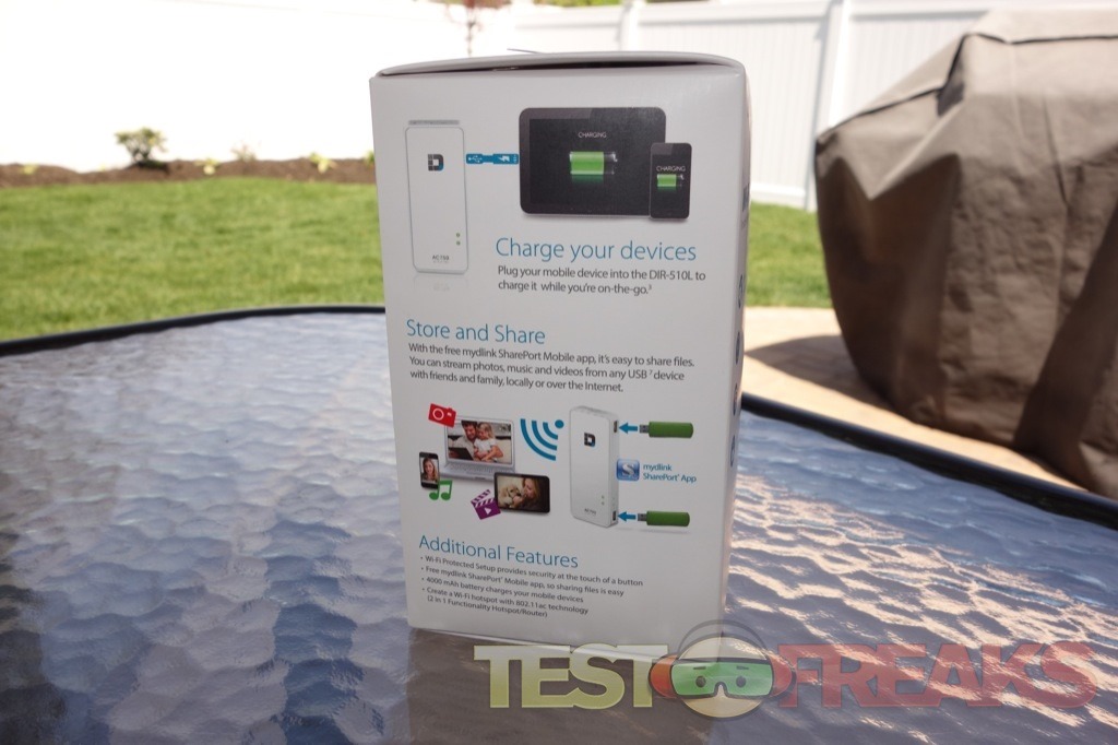 On one package side has a list of the Contents, Minimum Requirements, Power Input/Output and the name of the Mobile App to use in conjunction with the device. The opposite side shows how the D-Link SharePort Go III (DIR-510L) can function as a charger, remote USB storage, wireless storage/server device and portable battery.