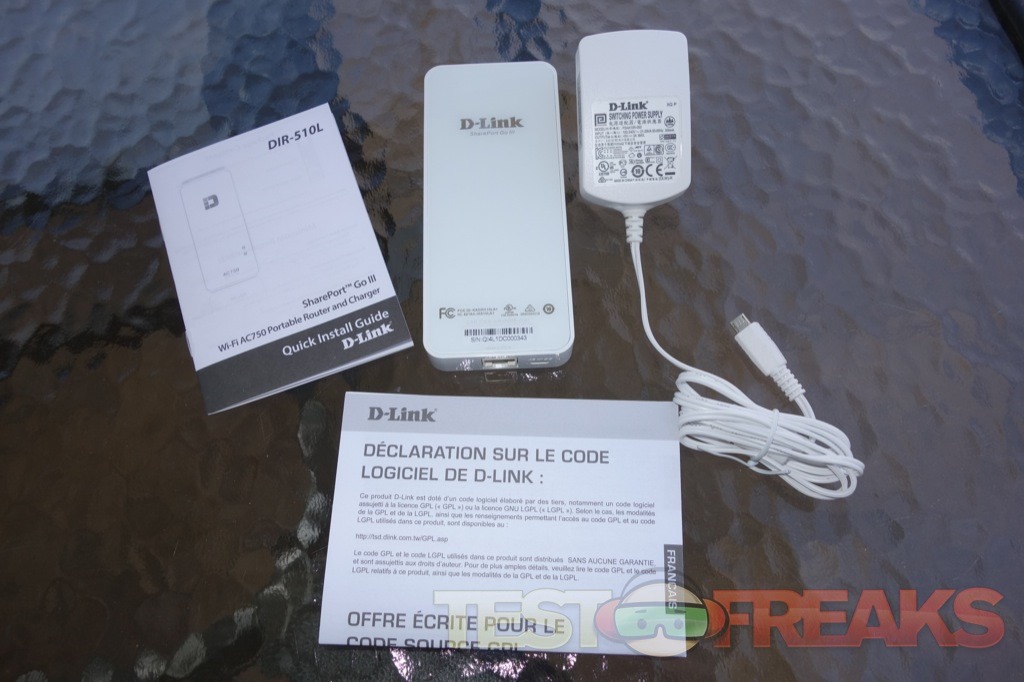 Opening the package we find the SharePort Go III (DIR-510L) portable router and charger, a power adapter with a micro-USB connector on one end, a quick install guide and warranty. The device measures14.0 x 5.9 x 1.6 cm (5.5 x 2.3 x 0.63 inches) and weighs 154 g (5.43 ounces)