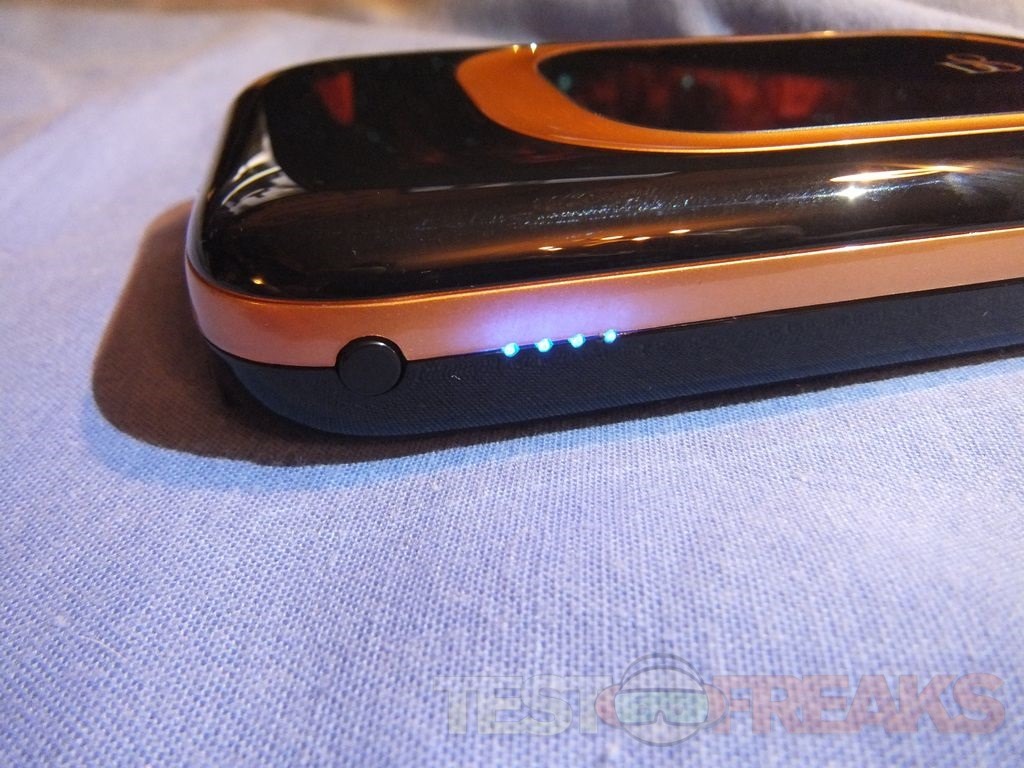 On the right side you’ll find a small black button and what look like four small holes but these are actually blue LEDs to indicate battery capacity. There are four LEDs and they represent 25% battery capacity each so you can get a good idea of how much you’ve got left. The button is for checking the battery capacity and for turning the iBag on to initiate charging.