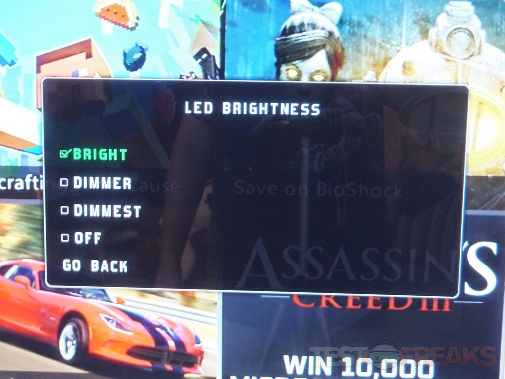 The LED Brightness menu has choices for Bright, Dimmer, Dimmest and Off.