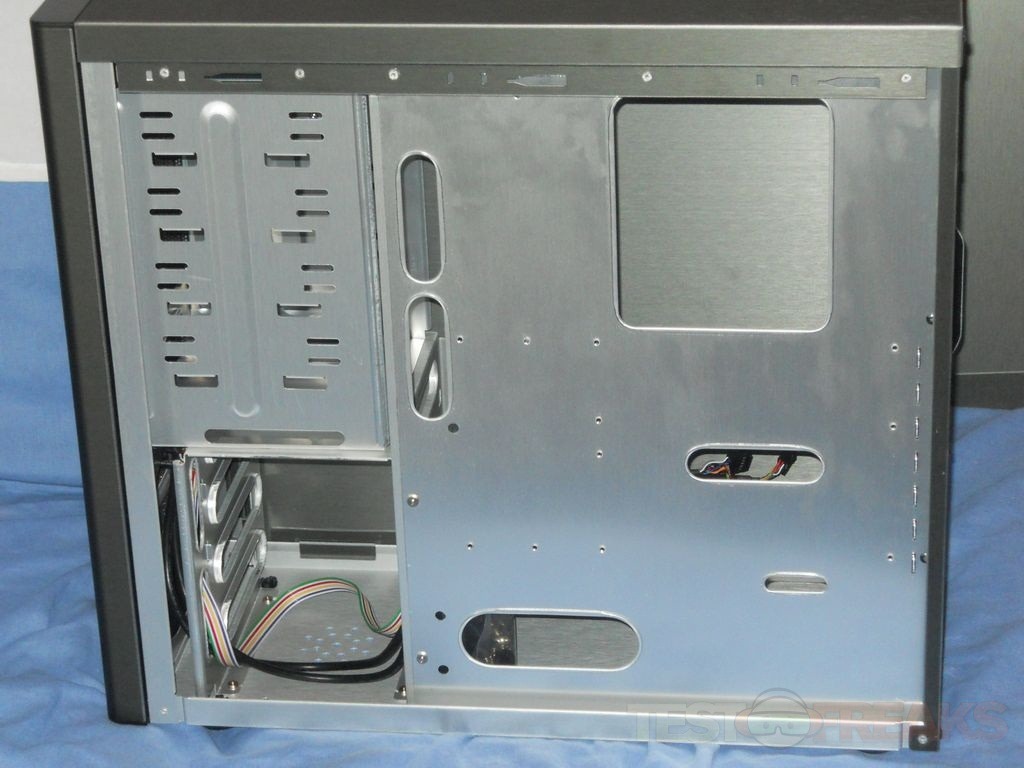 Removing the right panel we can see the back of the motherboard tray which has holes for routing cables through and a larger cut out space for swapping out heatsinks without removing your motherboard. As you can see the case isn’t painted on the inside and it’s rather bright.