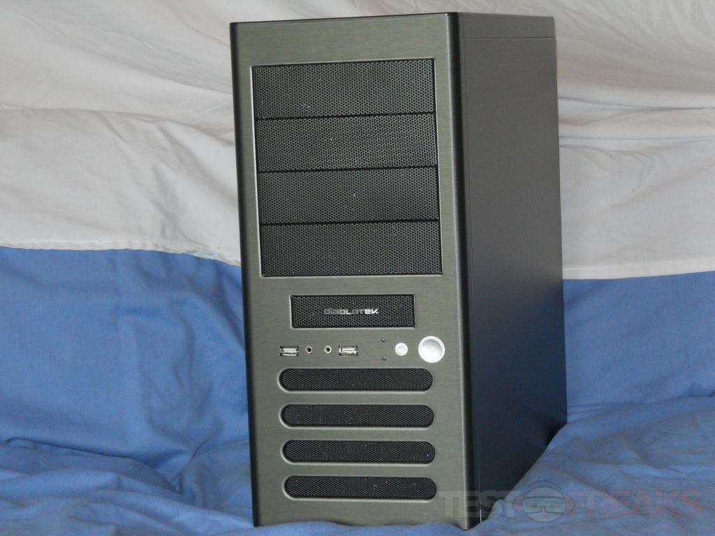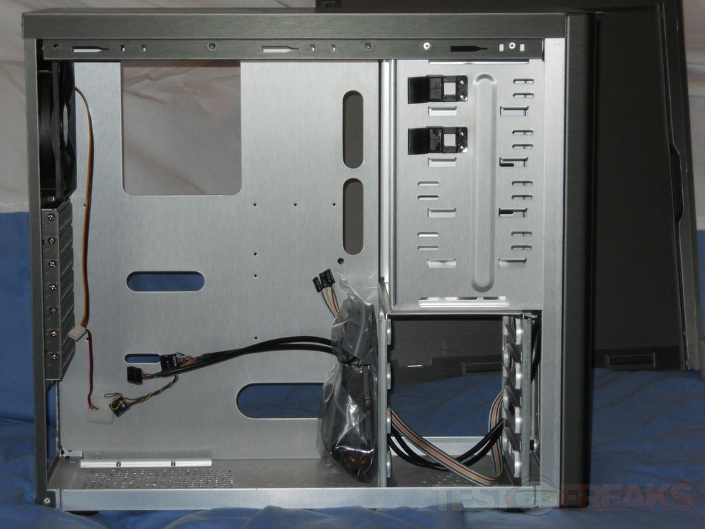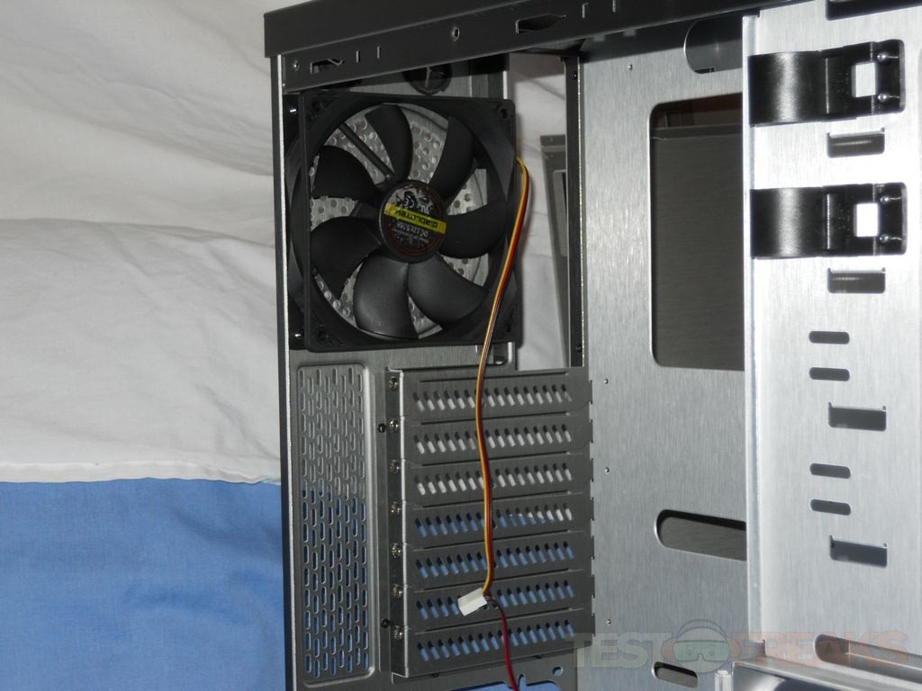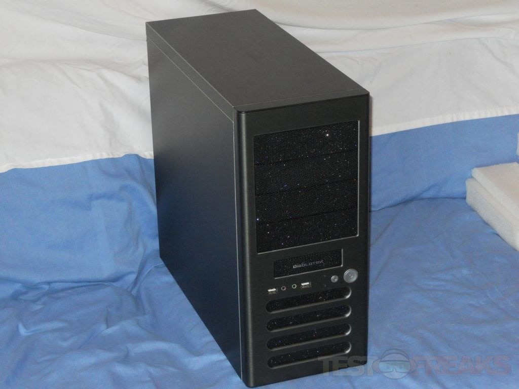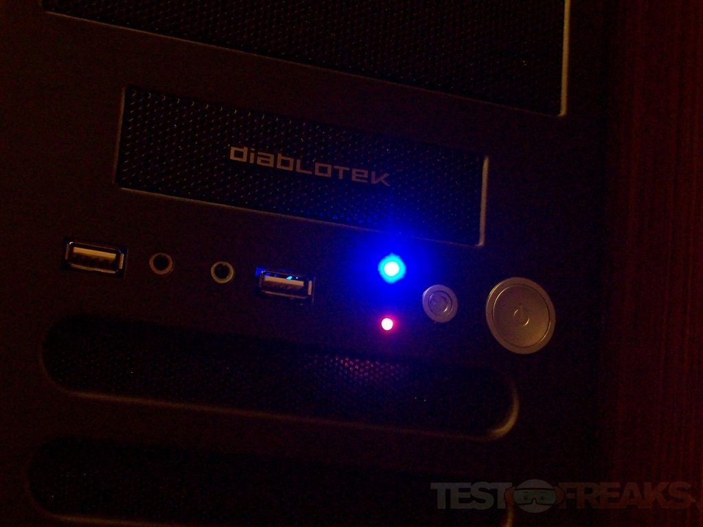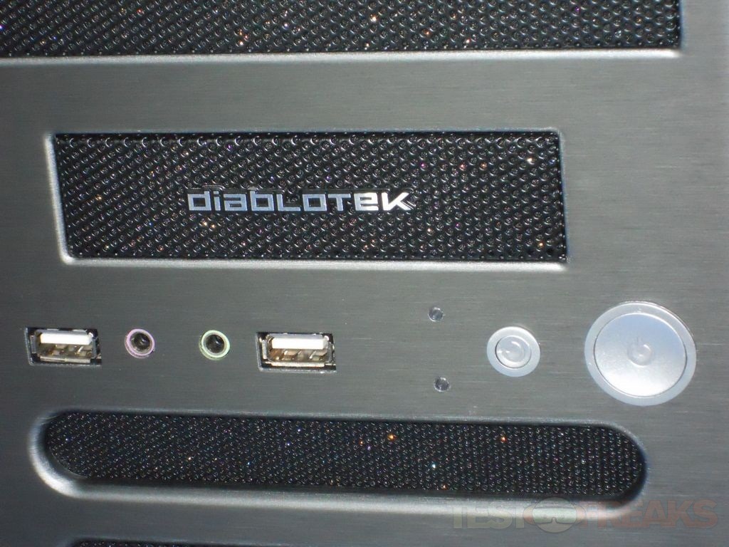 When I first open up the box and unpacked the Fly, the front bezel design reminded me of my Lian Li PC-8FI case. The front of the case has four 5.25” bays and one 3.5” bay which is behind the Diablotek logo, below that is the power and reset buttons, two USB ports, connections for audio and LEDs for power and hard drive activity. At the bottom of the case front are ventilation slits with space behind for a single cooling fan.
