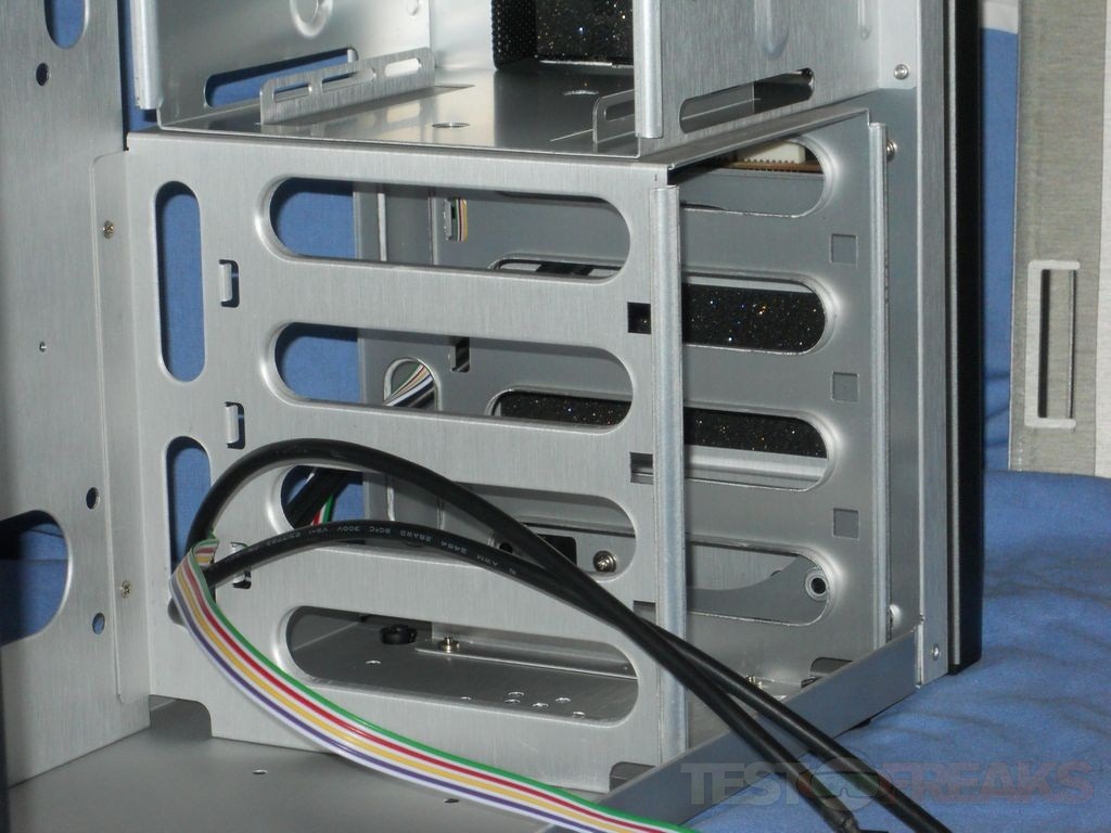 The hard drive cage can hold three hard drives, and the front fan will blow right across them. The drives are installed with rails which you’ll see a little bit later.