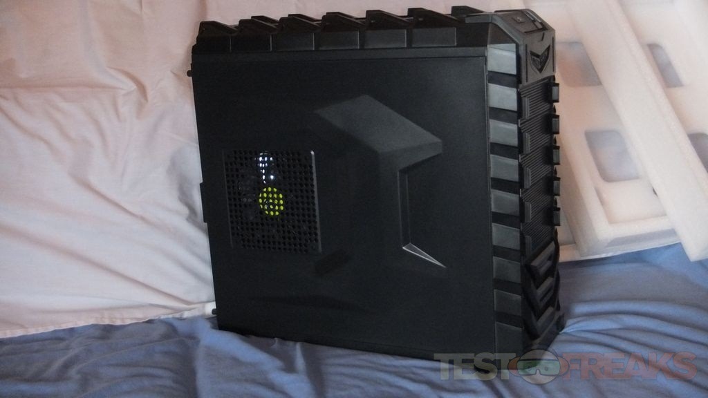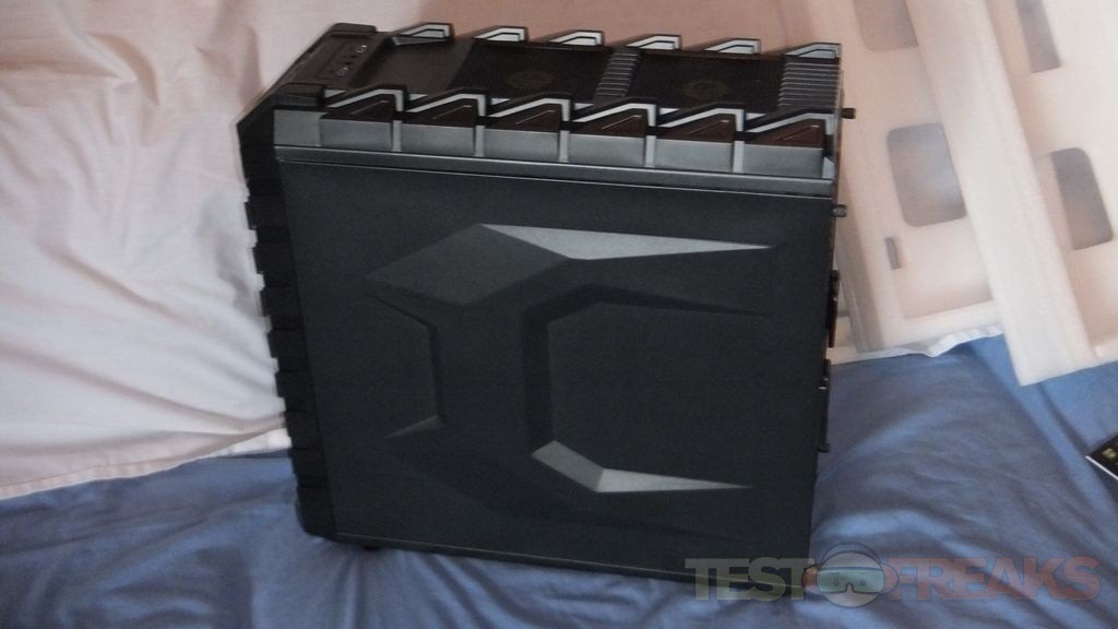The right side panel of the case has a protruding design on it meant not only for looks but to allow room for routing wires behind the motherboard.