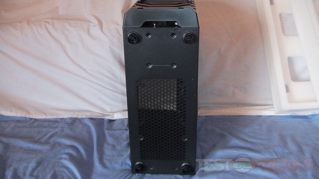 On the bottom of the Cyclops you’ll find four rubber feet and quite a bit of ventilation for the PSU and for an optional fan. There’s a holes in the bottom of the front bezel that’s used as a handle to remove the bezel.