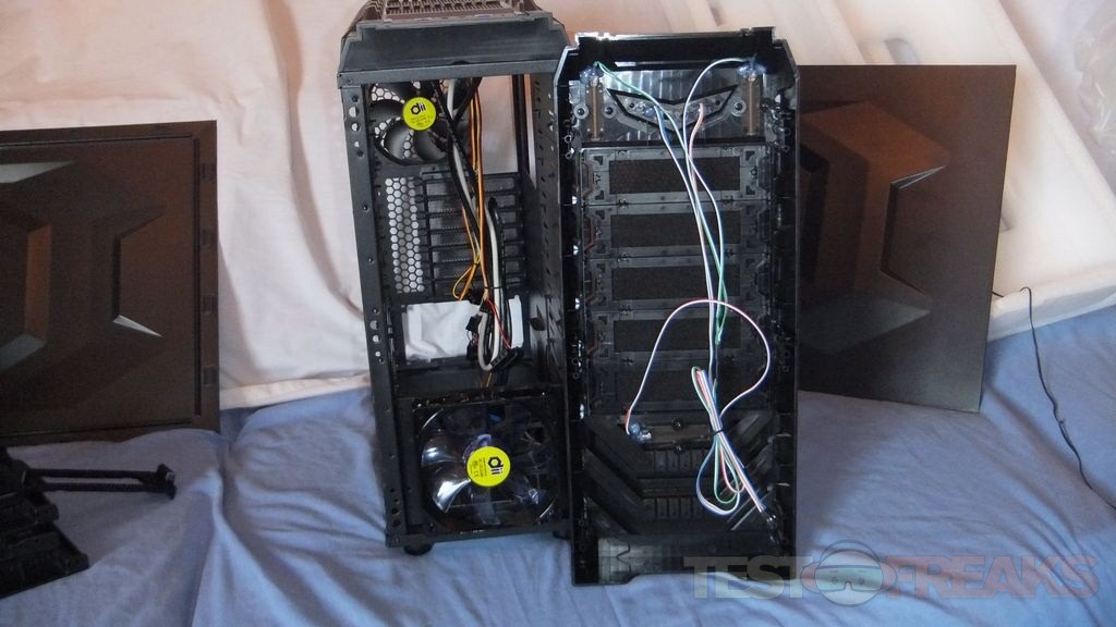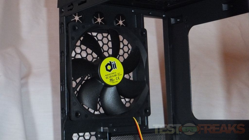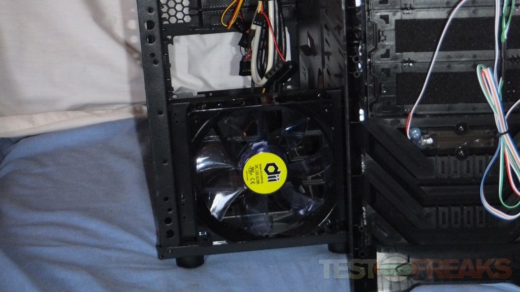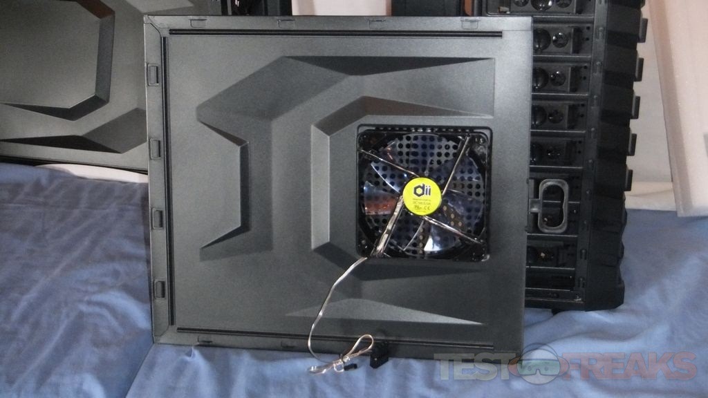 Taking the left panel off we can get a better look at the pre-installed fan, it’s black with clear blue blades.