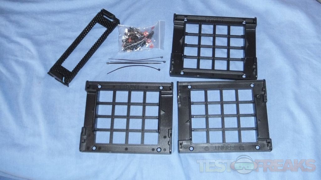 In the accessory box you’ll find a few zip ties, bag of screws, 5.25” to 3.5” bay adapter and three trays.