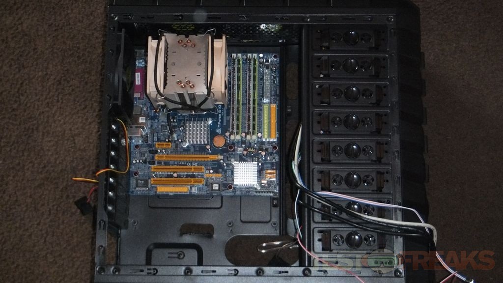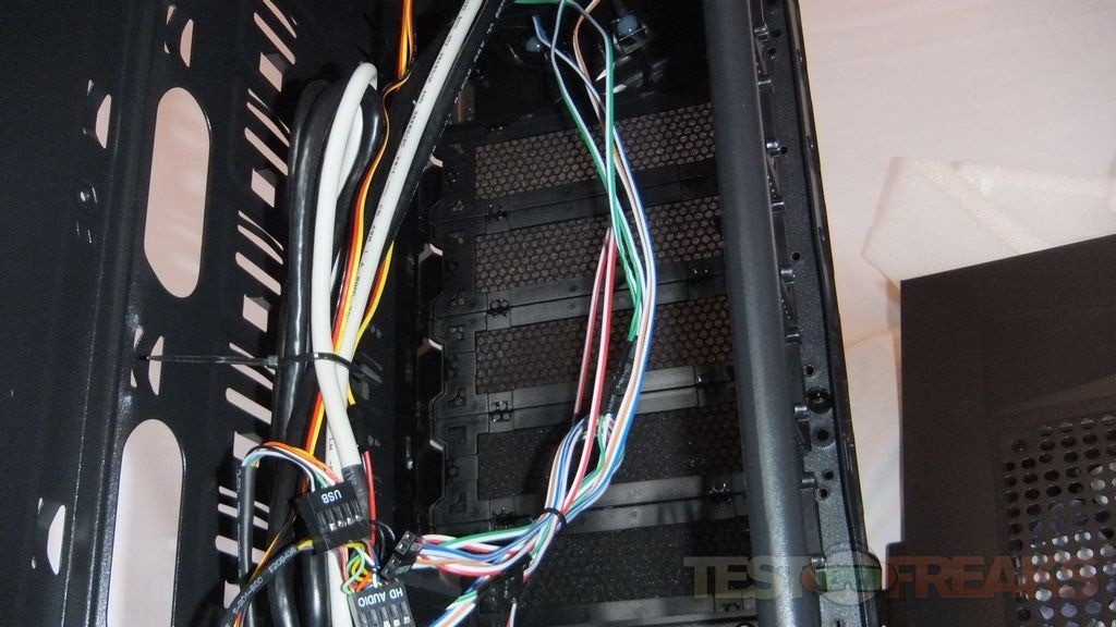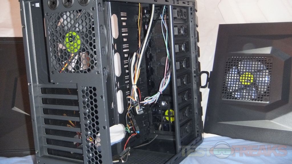 As I mentioned above there is a handle to help you remove the front bezel, it just pops off and on fairly easily. Here you can see a plethora of wires hanging around that will be connected to your motherboard.