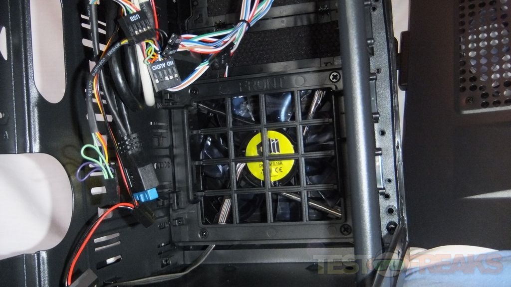 Here’s the inside view of the front fan and you can see two of the spots sticking up for mounting the SSD here as well.