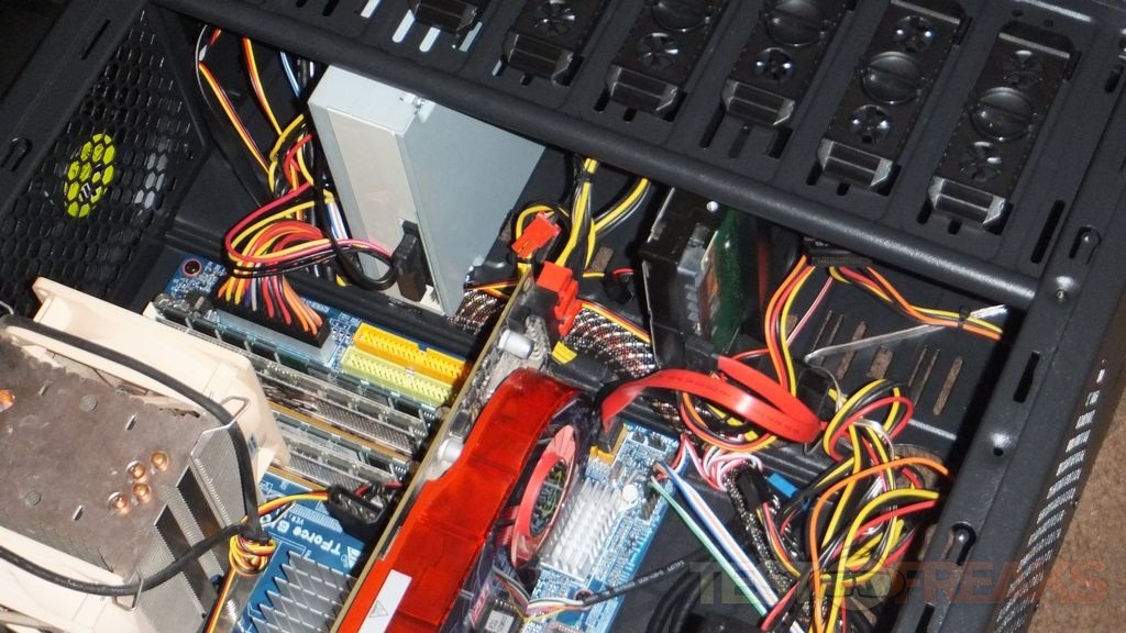 Some of the design aspects of the Cyclops are questionable like the fan/hard drive combination mounting system as it does block most of the airflow into the case. I do like the fact that there’s not really a hard drive cage so you’re not limited to where to install your hard drives, you can put them anywhere you need to depending on your space requirements. The specs list that you can install five hard drives in case and that’s true but it’s not true. When I read the specs I thought of standard 3.5” hard drives and I think most other people would as well, but Diablotek really means four 3.5” hard drives and one 2.5” HDD or SSD can be installed. Not a big issue but if someone is looking to buy this online and reads that they might be disappointed when it arrives to find you really can’t fit five standard hard drives in the case. Tip to Diablotek: please check your specs and features listing as something is wrong somewhere, either you forgot to include something or the specs and features listing is wrong.