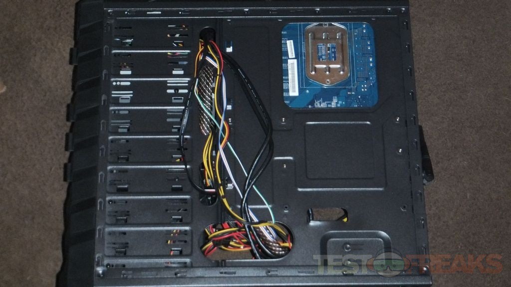 Taking the right panel off you can see the back of the motherboard tray with a large opening for installing or swapping CPU coolers without having to remove the motherboard from the case. There are holes for routing wires through and a few spaces to secure them in place as well.