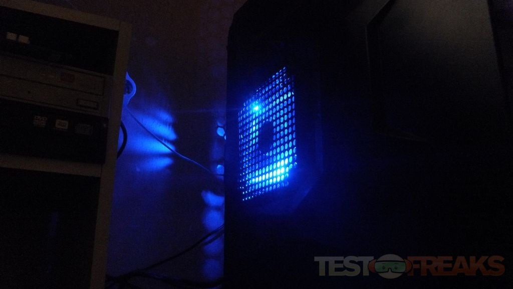 Next up was getting my system in the case which I started with the motherboard of course. The stand-offs went into the tray easily, which is nice as with some cases you’ve got to struggle to get them in because of extra paint in the holes. I did have an issue getting the motherboard fastened to the tray as they didn’t line up perfectly. I had to put the screws in part way and push and pull the motherboard up and down and back and forth to get all of the screws in place. The top two screws near the CPU cooler where the hardest as they’re not much room once the cooler in installed. Installing the cooler after the motherboard is in place will alleviate that problem though with the space limitation at the top of the case. There’s one more thing I should note about the installation process. When I was trying to put the motherboard I/O plate cover in the case it was really hard to get in as the metal seems rather thin and flexible at the back of the case. It didn’t just pop in like other cases, I had to fight with it for several minutes to get it correctly in place as the metal kept flexing making the I/O plate pop back out. It was a frustrating and rather annoying experience. So then I proceeded with the rest of the installation, this is for my kids computer where they mostly play online games and I’m using an ATI Radeon 4890 which is a rather large video card and it fits in the case just fine with space left over. To install the hard drive you need to use the included trays and use the screws to attach them to the trays. Then you just slide it into place and secure it with the clips and then screws on the opposite side. I’m not sure about the clips though as that makes the case only half tool-less. The clips are used on the one side and not the other meaning you use the clip on the left side and then screws on the right. That doesn’t make much sense to me at all. Personally though I prefer using screws for everything as all clip systems seem to not fully secure any drives really. I don’t understand how you’re supposed to fit five hard drives in this case since there are only three trays included and then you can mount one vertically so that’s only four drives total. You cannot remove the bottom tray to use it as a regular tray as the front fan is attached to it as that’s how the fan in mounted in the case. Then if you use one of the trays for a 3.5” device like a card reader or maybe even a floppy drive then you’re down to three hard drives. Unless of course they were supposed to include four trays and only sent me three?! Maybe they’re counting the space at the bottom for a 2.5” SSD or 2.5” HDD as another space for a drive which is possible. So then I guess you can fit five hard drives in there, just not all 3.5” in size. Then again the specs state you can fit five 3.5” devices in the Cyclops case, but you really can’t. If I want to get really picky here, the specs state: The Diablotek CYCLOPS case provides Five spaces for external 5.25” drive bays, and Five spaces for internal 3.5” drive bays. To me that reads there’s ten bays in total, five for each, but there really isn’t as there’s only nine in total which you can see just by counting the bays, there’s only nine of them! Here’s the same picture below I showed you earlier in the review, there are eight clips for the bays and then at the very bottom is another space without a clip for a total of nine. If you go back up and read about the trays there’s only three extras included so you can still only fit four 3.5” drives in total in the case. Either they forgot to include another tray or the specs are wrong?! Mounting the drive vertically where the front fan is though pretty much blocks most of the incoming air, not sure if I like that design or not. If you opt to add another fan/drive combination it’s installed vertically and takes up three bays so it really limits your options. Feasibly it could be fine as toss a 3tb drive in there and you should be good on space so you might not need more drives. I guess it all depends on your storage needs as to the configuration of the drive in the case. Depending how many hard drives you have and how long your video card is you may not be able to put the drive across from the video card. You can see in the picture below how close the power connectors are to the hard drive. I mounted it offset, the hard drive is one bay down from the video card as it was just too tight with the connectors from the video card and hard drive. The right side panel is designed with space to allow you to run cables behind the motherboard tray. The panel has a design that protrudes outwards so you can fit the cables back there which is a great feature I think. There are five fans pre-installed in the case for cooling and I can’t say they’re exactly silent but they’re not overly loud either and five fans should be more than enough to keep your system running cool. The side fan is very bright and the front fan is fairly bright as well. The lighting of this case is rather unique it looks as though it has two red-eyes at the top which doesn’t make much sense to me as the name of the case is the Cyclops?! Here’s the whole front of the case: Then here’s those two ‘red-eyes’ that indicate power essentially. Towards the bottom of the case, where the front fan is located, you’ll find the hard drive activity light. It’s lit blue and then changes to red when activity is detected. The blue glow or light you see through the front bay covers is actually the very bright side fan. Here’s that side fan, yes it’s very bright. The light comes out the side, through the front and out the back as well. Overall I really like the looks of this case, but I think I would have rather had red LEDs for the fans, but that’s just a personal preference. I think red would have just made the case look much better.