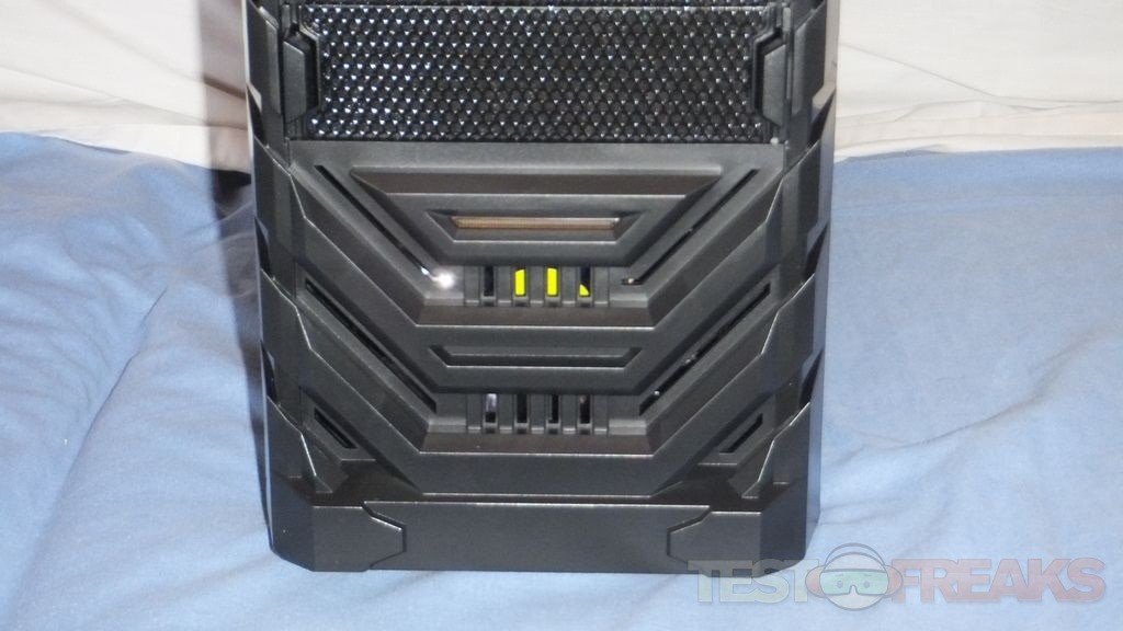 There are two large buttons on the top of the front bezel for power and reset and on either side of those are LED strips that light up to indicate power.