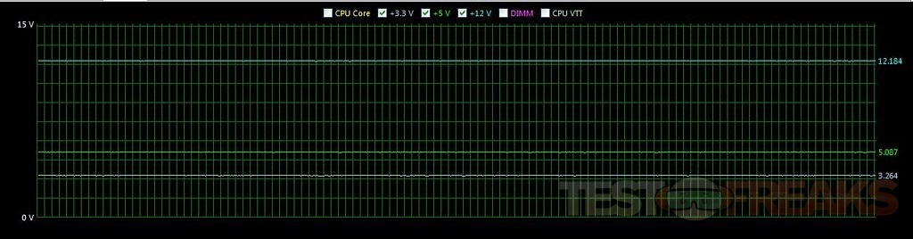 A little low on the 3.3V rail as you can see, but well within tolerances. The 12v line does very slightly dip below 12v, but for the most part it’s fairly stable. The 5v line didn’t change much at all, pretty stable overall.