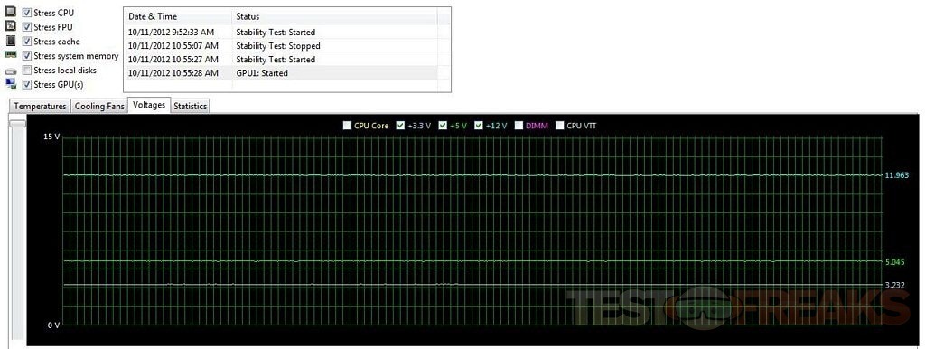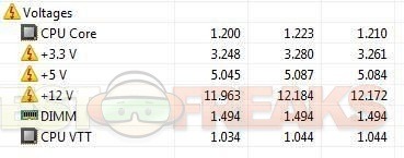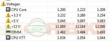 The voltages dropped when compared to just running the CPU tests, but that’s expected with a heavier load on the system. Still all within tolerance levels which is what you want to see.