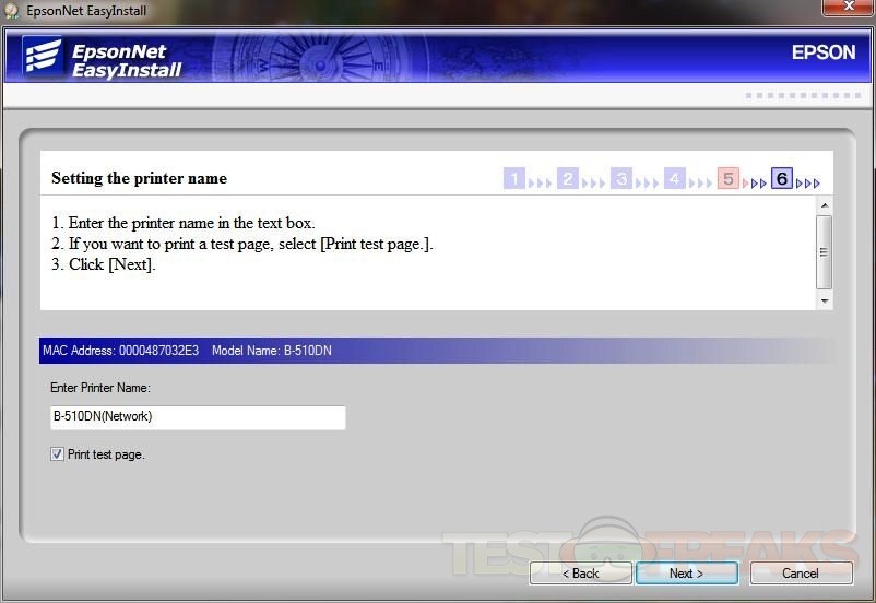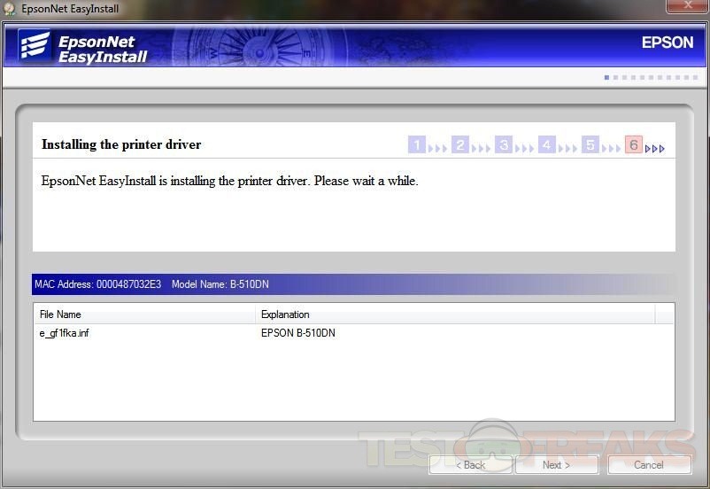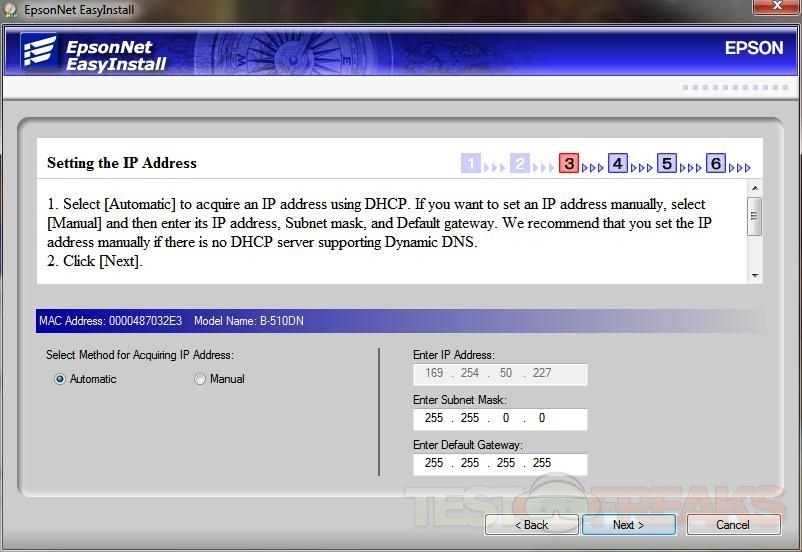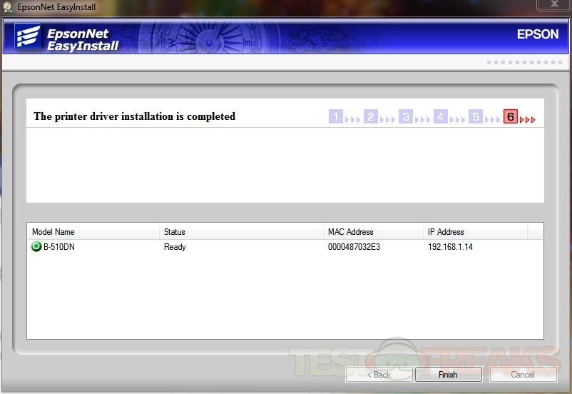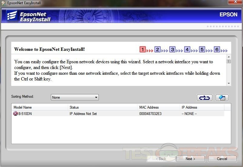 Up will pop the EpsonNet EasyInstall screen. Just follow the prompts to install the printer on your network. The screen below shows no IP for the printer, all I had to do was turn the printer off and then back on and the IP appeared.