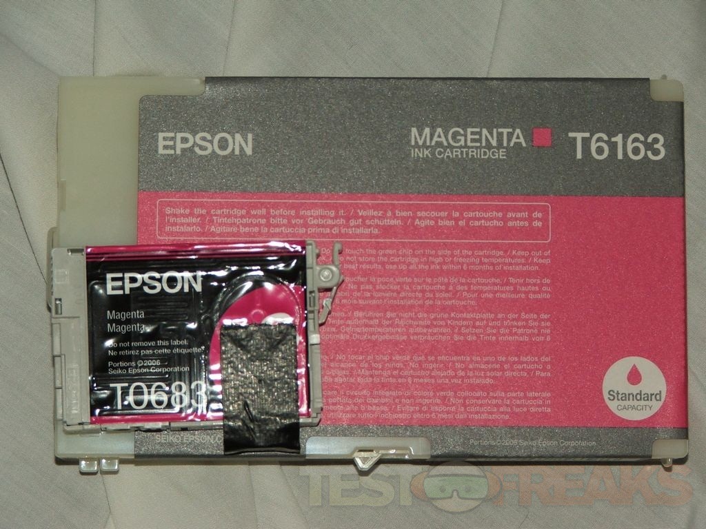 The ink cartridges are just amazingly large. To give you an idea of just how big they are, here’s a cartridge with a regular ink cartridge for the Epson WorkForce printer.