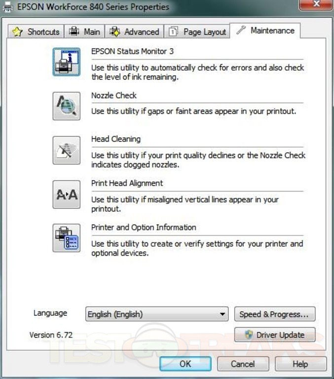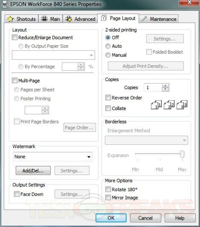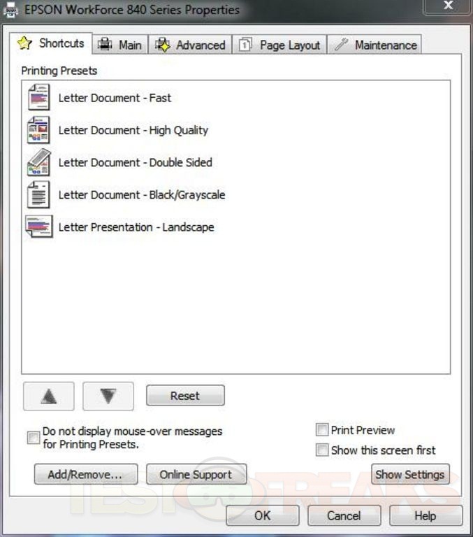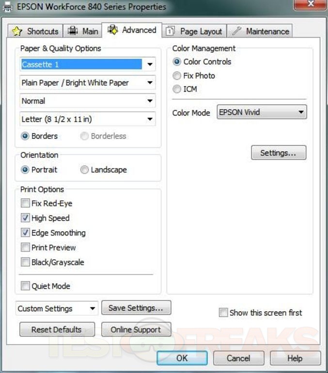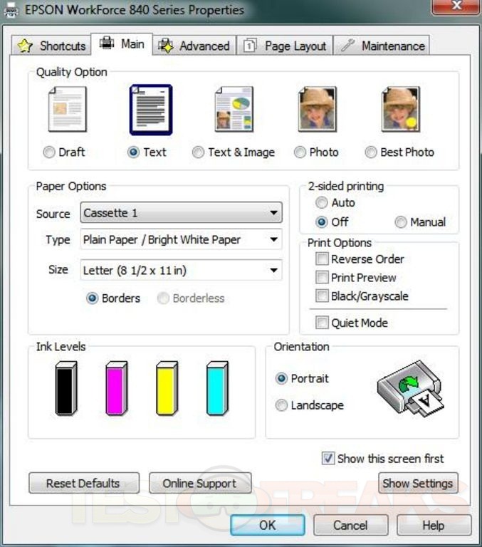 Once installed you can then access the settings through five basic screens. Under the Main tab you can select the quality from five settings for Draft, Text, Text & Image, Photo and Best Photo. You can also select 2-sided printing and a quiet mode as well and see the ink levels. You can see for yourself the rest of the tabs and settings.