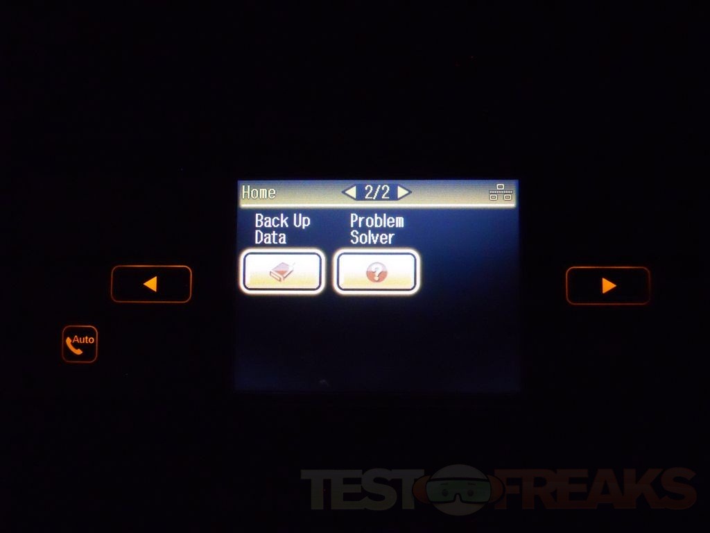 The LCD display when on the main screen offers two pages of options for Copy, Fax, Scan, Print Photos, Print Ruled Papers, Setup, Back Up Data and Problem Solver.