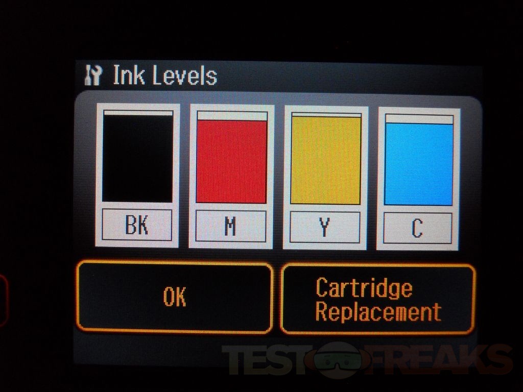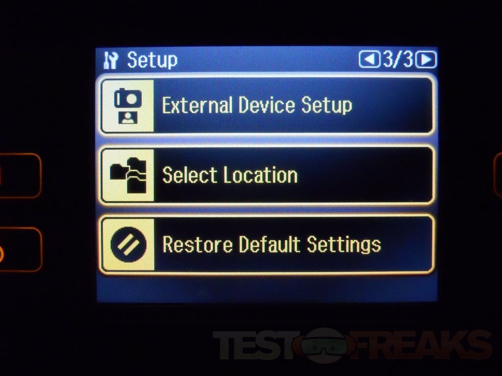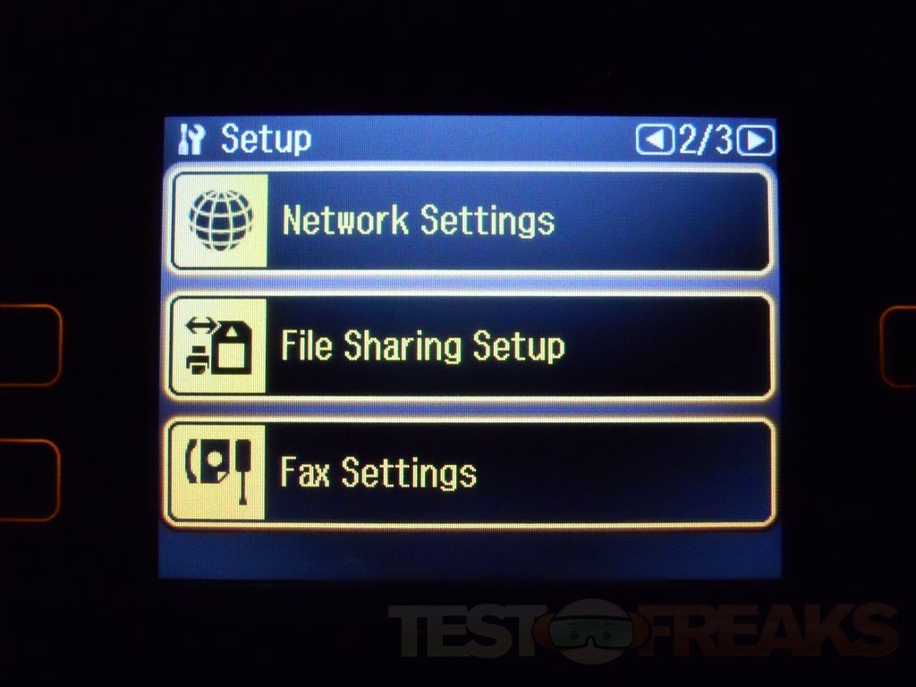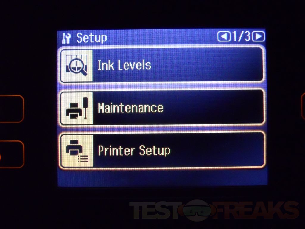 Under Setup you’ll find three pages of choices for Ink Levels, Maintenance, Printer Setup, Network Settings, File Sharing Setup, Fax Settings, External Device Setup, Select location and Restore Defaults.