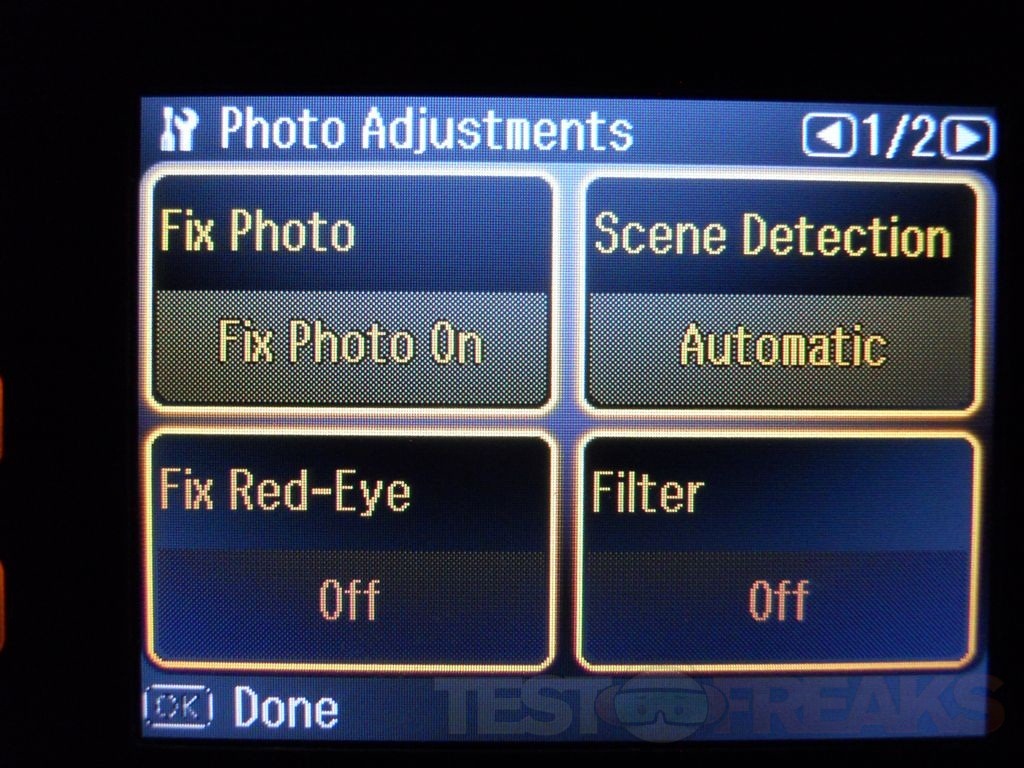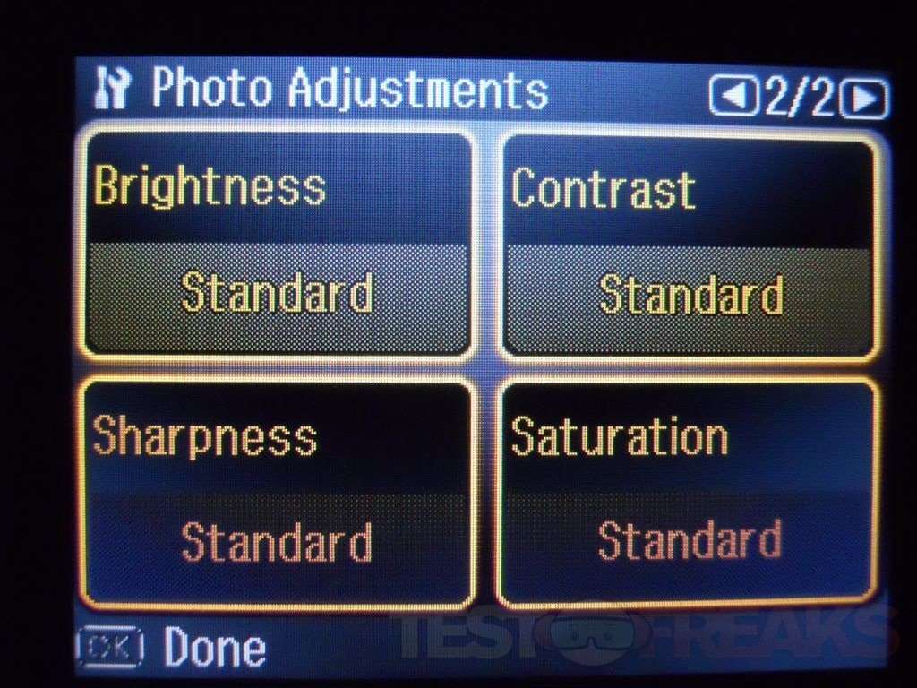 Browsing around the menus, under External Device Setup and then under Print Settings you’ll find options for photo adjustments which is interesting.
