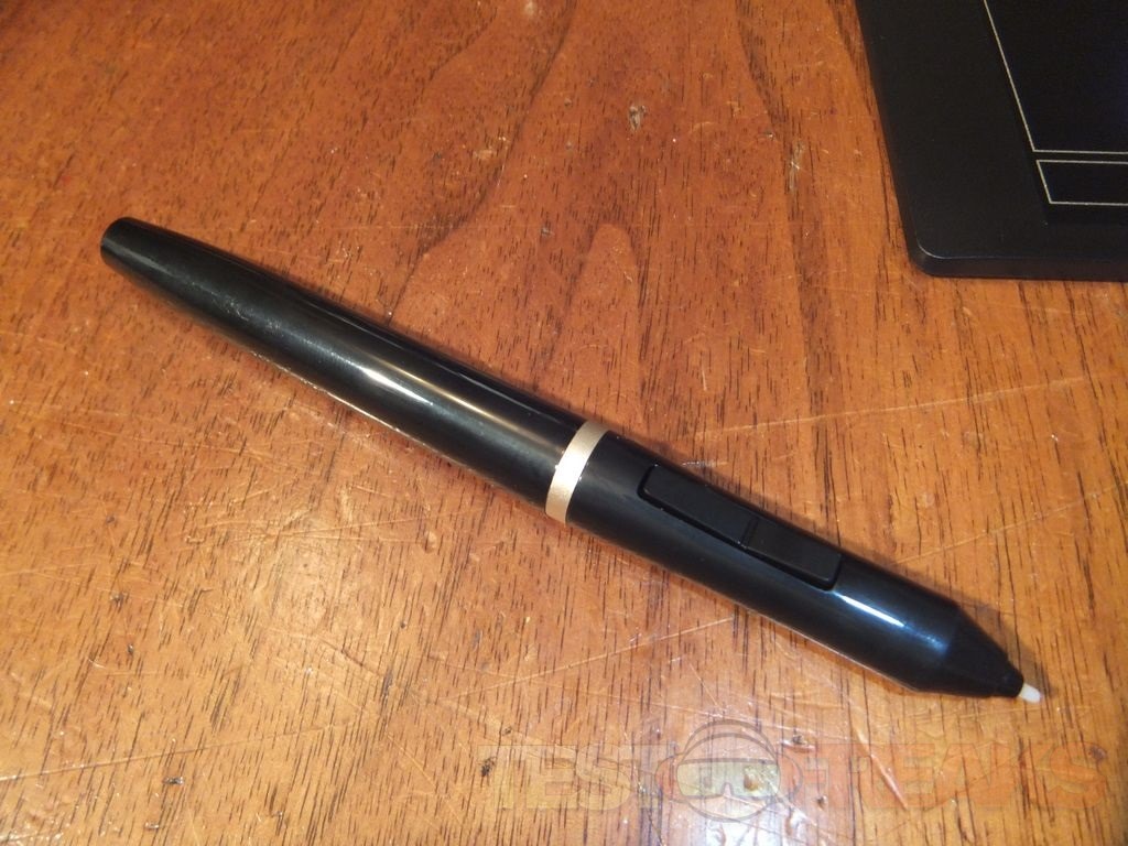 Here’s the pen itself, yes it’s big, but most every tablet pen is, but still it’s comfortable to hold. The pen has two buttons on it which can function like your mouse buttons for right and left click. Yes the pen is wireless, which I think is a must-have feature for drawing and pretty much anything with a tablet.