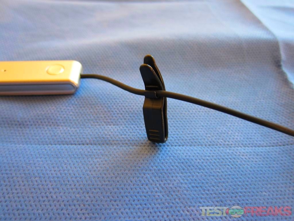Below this controller is a black adjustable clip for securing the microphone to the user’s clothing.