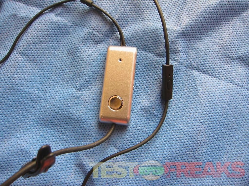 The cord running to each earpiece is asymmetrical with the right one being much longer. Below where the cord divides we see a microphone/controller dongle. This silver rectangular piece has a circular talk button and microphone on the outside with a volume control slider on its side. On the back we see the HS-200 Gold name imprinted.