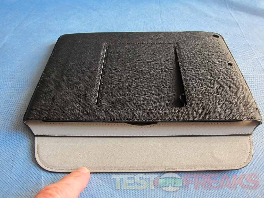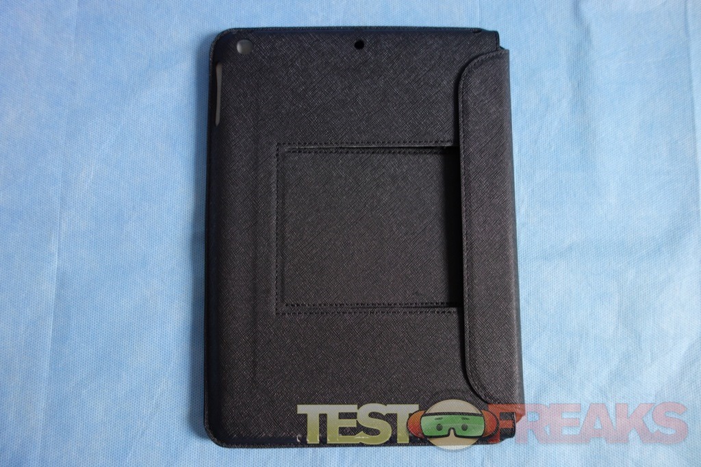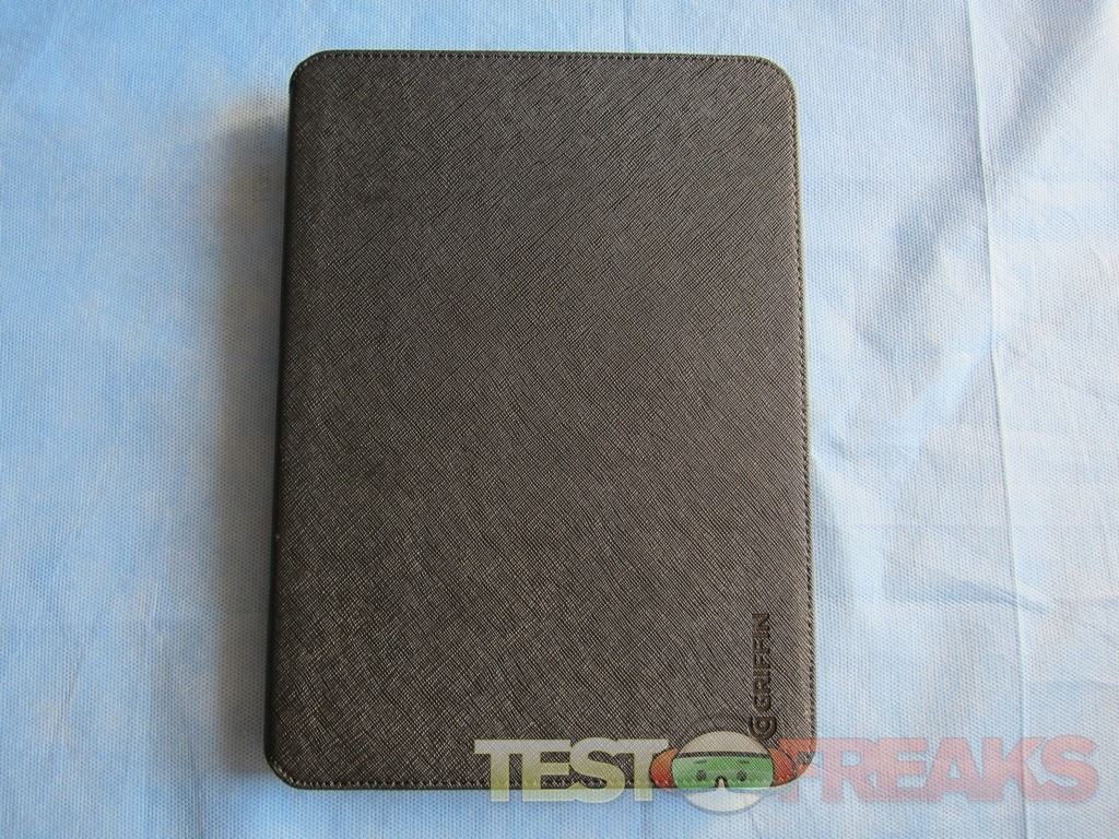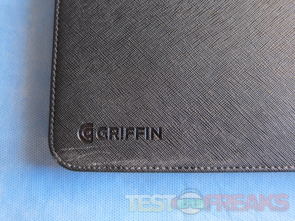 On the front cover we see the Griffin name and logo on the bottom right corner. This cover wraps to the back where we find an easel stand in the middle for placing the iPad Air into a typing friendly position.
