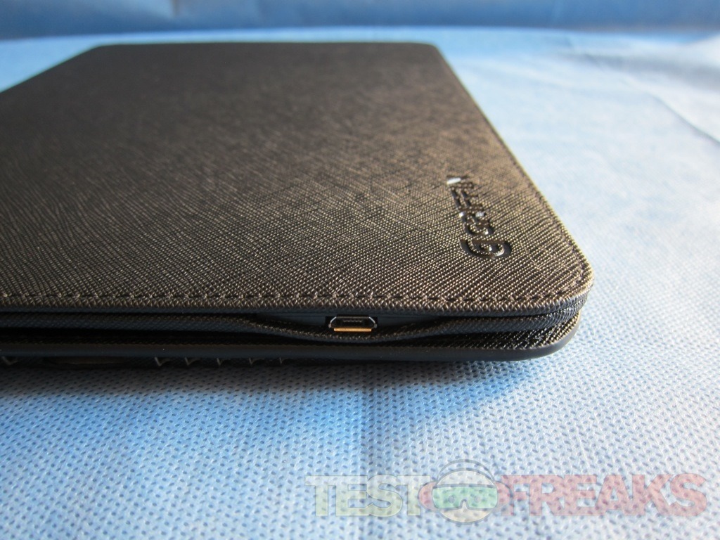 The Slim Keyboard Folio charges via a micro USB connector found on the bottom right of the front cover just beneath the embossed Griffin logo. The Slim Keyboard Folio comes with a rechargeable lithium ion polymer battery.