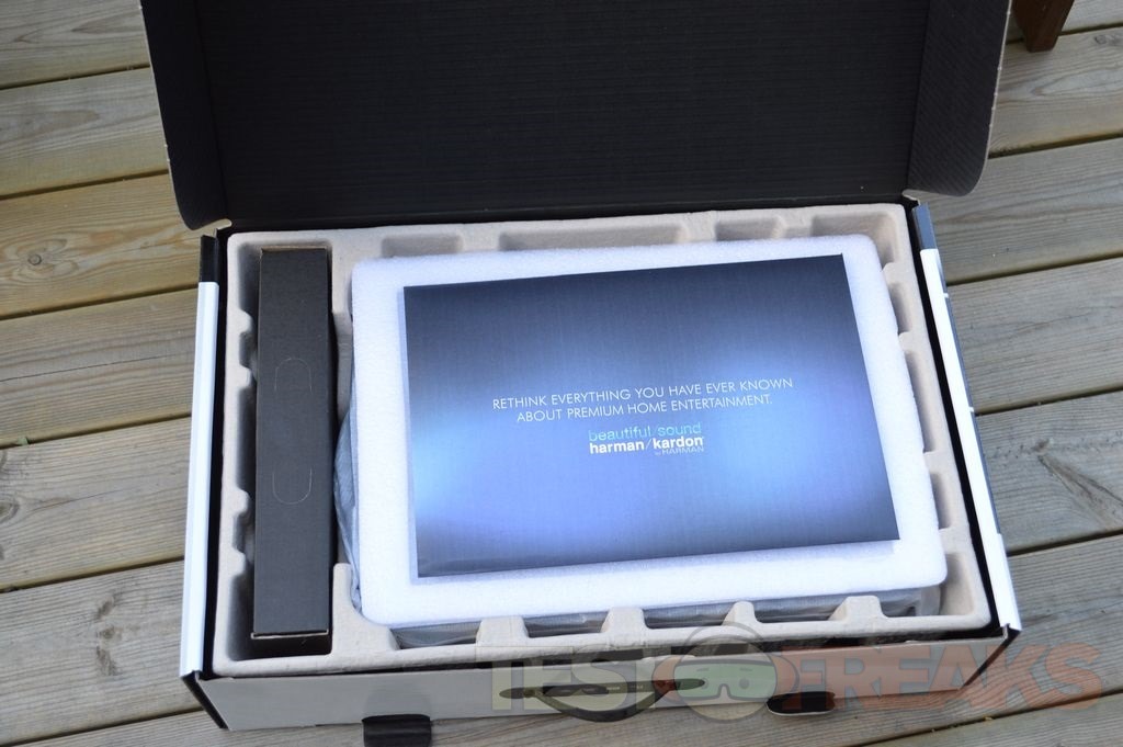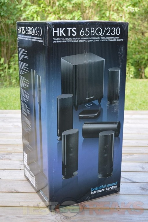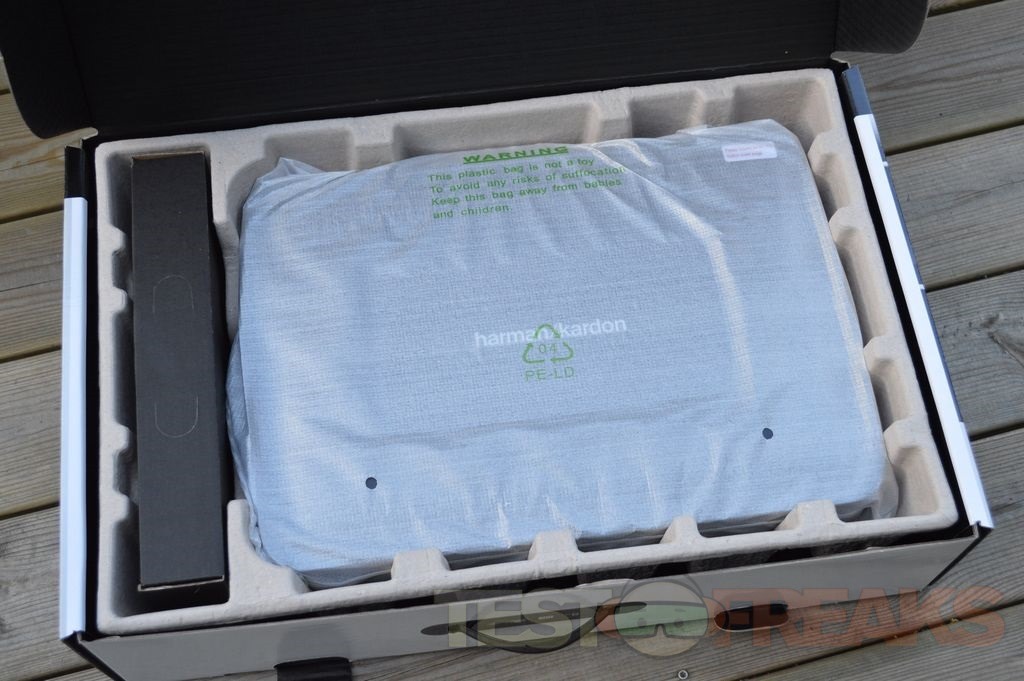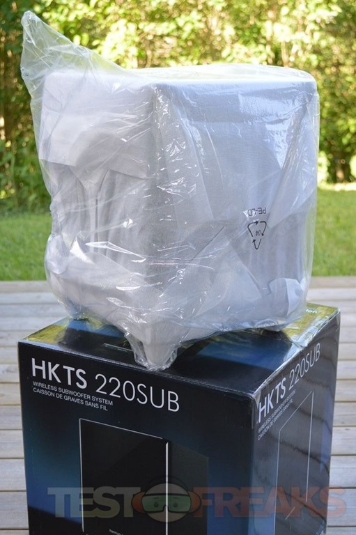 It’s beautifully packaged, with my only complaint being that the silica gel bag had split, spilling those little beads all over the place. There’s protective plastic on the Blu-ray unit, as well as on the HK logos on each of the speakers which should be peeled off.