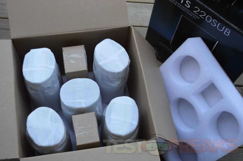 The plain box contains each of the 5 speakers individually wrapped. Then you’ll find another two boxes containing the wall brackets and speaker cable.