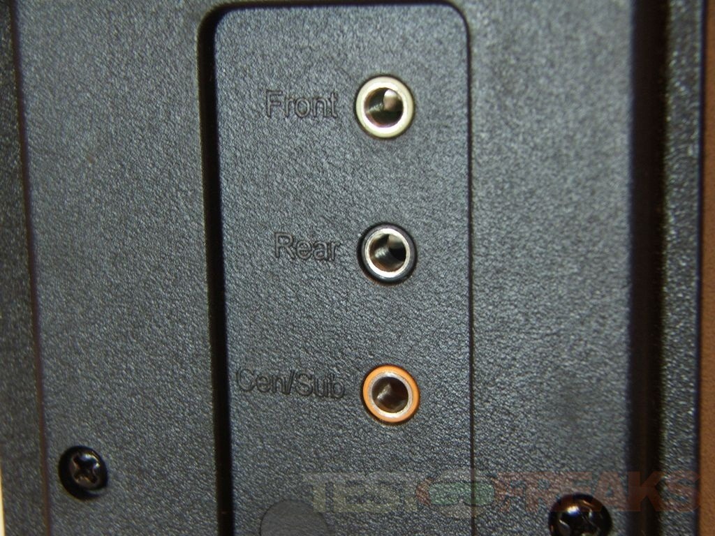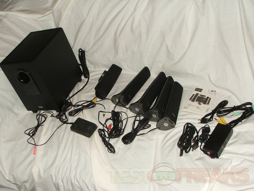 Once unpacked you’ll find satellite speakers for left, right, two for the rear and one for the center. The subwoofer is what everything connects to and coming from that is a remote control that features outputs for headphones and microphone and an input as well. There’s also a power supply and some brief documentation and three audio cables for connecting from your computer.