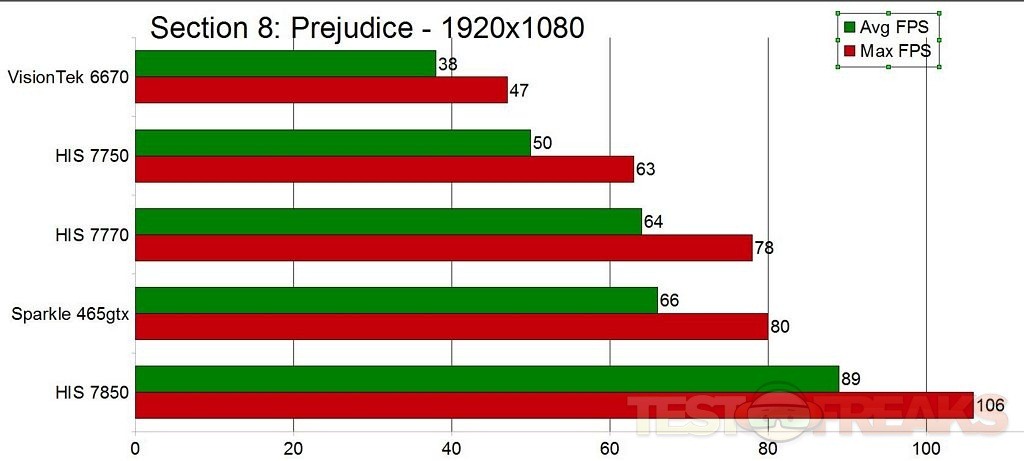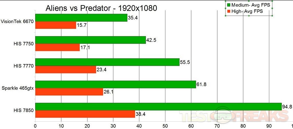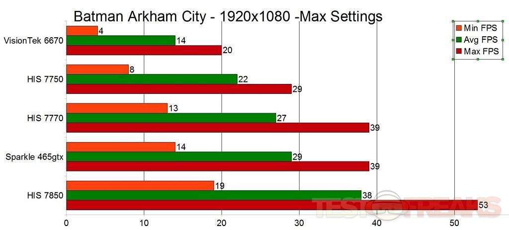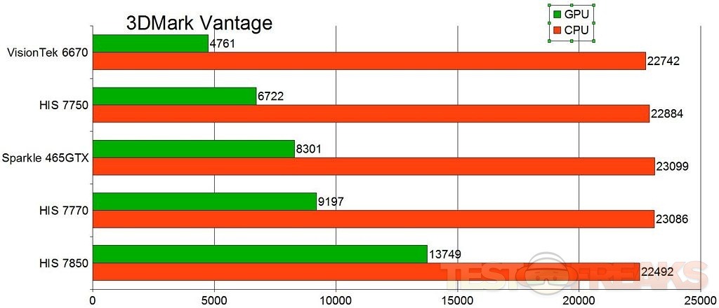 Here the card installed in my system along with the 7770, the cards are pretty much the same size. They’re both rather small for next gen cards making them able to fit in most systems with ease. Here’s the 7770 and the 7850 for comparison: The shroud on the 7770 makes the card look a little bigger. Let’s start out with the iTurbo software I mentioned earlier: iTurbo Software: HIS has just came out with software that they call iTurbo which can help you keep the card cool and quiet or overclock. It allows you to monitor and adjust fan settings along with the card itself. The interface can be in minimized mode which is a small circle. pressing one of the buttons put it into full sized mode where you’ll se much more info. The word iTurbo in the center is actually a button that will automatically overclock the cad for you, but it barely does anything, you’ll be better off handling that manually I think. The software has five tabs across the tab for Home, Info, Overclock, FanControl and Settings. The home screen just basically shows news and has links to update the drivers. The Info tab is just that, information about the cards in your system. The bottom of the interface has a power status indicator that changes colors and a temperature display as well. The Overclock tab lets you adjust the Core and Memort overclocks and save four profiles so you can quickly switch between them. The FanControl tab is kind of self-explanatory, you can adjust the settings to your liking and save them as profiles to Quieter or Cooler. The Settings tab has some basic things you can change. I found the software to be rather useful and very easy to use, it also works with the 7770 that I recently reviewed. Coming up is the testing section and I’ve put the HIS 7850 up against a VisionTek 6670, HIS 7750, HIS 7770 and a Sparkle Nvidia 465 GTX. So let’s get into actual testing and we’ll start with the basics. 3DMark06 is up first: So we’re off to a good start it looks like, a nice improvement over the 7770 and the 465gtx. Next is 3DMark11 running at all three modes, Entry, Performance and Extreme. There’s a nice improvement across all of the tests as you can see, the 7850 does very well. Next up is 3DMark Vantage running at the Performance default settings at 1920×1080 resolution. The CPU score dropped for whatever reason, but as you can see there’s a marked improvement in the GPU scores here. Let’s more on to gaming starting with Aliens vs Predator. I ran two sets of tests at medium settings and maximum settings, both at 1920×1080 resolution. Here’s the actual settings in screenshot form: Then here’s the graph with the results: Running at the medium settings we see a huge improvement in performance, running at maximum we can play the game with a decent 38.4FPS. Next up is Section 8 which runs off the Unreal 3 engine, settings were all maxed out at 1920×1080 resolution. All of the cards can run Section 8, no big deal here. The next game I played was Mafia II at a resolution of 1920×1080. I ran two different sets of tests with the settings on max but one set was with Antialiasing on and the other is Antialiasing off. The first test is with Antialiasing on: Here we see a very nice improvement in the frame rates when moving to the HIS 7850 video card, the game runs fine with maximum settings on. Next would be with Antialiasing off: All of the cards see an improvement here, but that’s expected. The game still looks decent with AA turned off. The next game is Just Cause 2 with two tests for this one, but are at 1920×1080 resolution. In the graph you’ll see two sets of results, one labeled Max and one labeled Med or medium. Max is everything on maximum setting while medium is Motion Blur is off, Texture Detail is High, Shadow Quality is Low, Antialiasing is 2x, Anisotropic Filtering is 4X, Water Detail is Low, Objects Detail is Low, Decals are On, Soft Particles are On, High-Res Shadows are Off, SSAO is Off and Point Light Specular is Off. I used the Concrete Jungle test level for all of these. On medium it’s pretty much a tie but with the settings maxed out we can see the 7850 does a very good job at Just Cause 2. The next test is two more tests with two more graphs, and it’s Dirt 3. The first is maximum setting with everything set to High or Ultra where available, the highest settings of the game. Here again we see a nice improvement when using the 7850. Next would be on high or what I consider medium settings and at 1920×1080 resolution of course. The next fastest card is the 465gtx and the 7850 easily gets almost 30 more FPS on average, that’s pretty good I think. Let’s visit Batman with Arkham Asylum up first on maximum settings at 1920×1080 resolution. There’s a drastic increase here, the game plays smooth as butter on the 7850. Lastly we have Batman Arkham City and with two graphs one medium settings and on maximum settings. First up is the medium settings: Very good I think, very much playable at these settings. Let’s see how the 7850 does once we turn up all of the settings: The average FPS is 38, which isn’t bad but it does have a minimum FPS of 19, so there might be some slow downs here and there but overall I found the game to be very playable even at the highest settings. AMD Eyefinity: I don’t use Eyefinity personally, I’d like to but that would mean buying new monitors with displayport connections. I did configure Eyefinity for two monitors and run a few tests to see the performance. No pretty graphs, just some data for you. For Aliens Vs Predator here’s the results at max settings at 3984×1080 resolution, I only got 24 FPS, but it was expected. For Dirt3 I ran two sets of tests at 3976×1080 resolution. I ran Max settings and settings on High. Max Settings: Minimum FPS: 26.18 Average FPS: 30.80 High Settings: Minimum FPS:54.37 Average FPS:65.65 Just Cause 2: I then ran the same Just Cause 2 tests, maxed settings and high settings, as I ran earlier at 