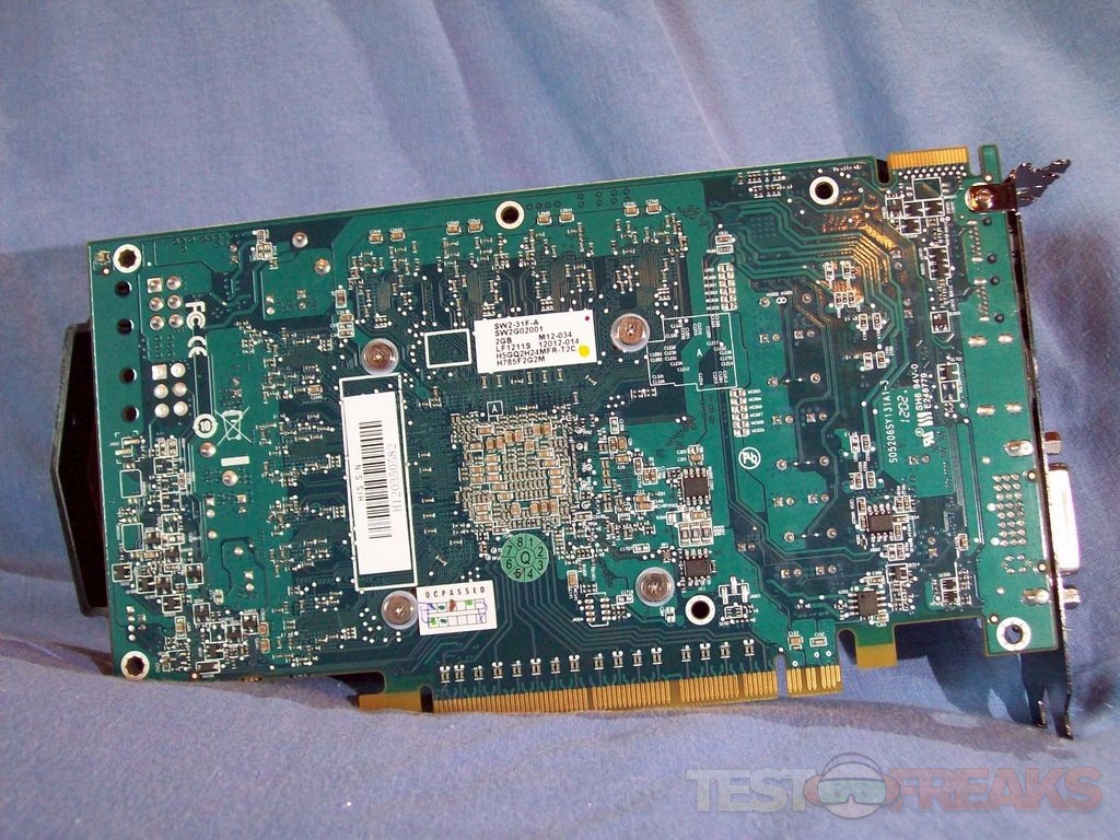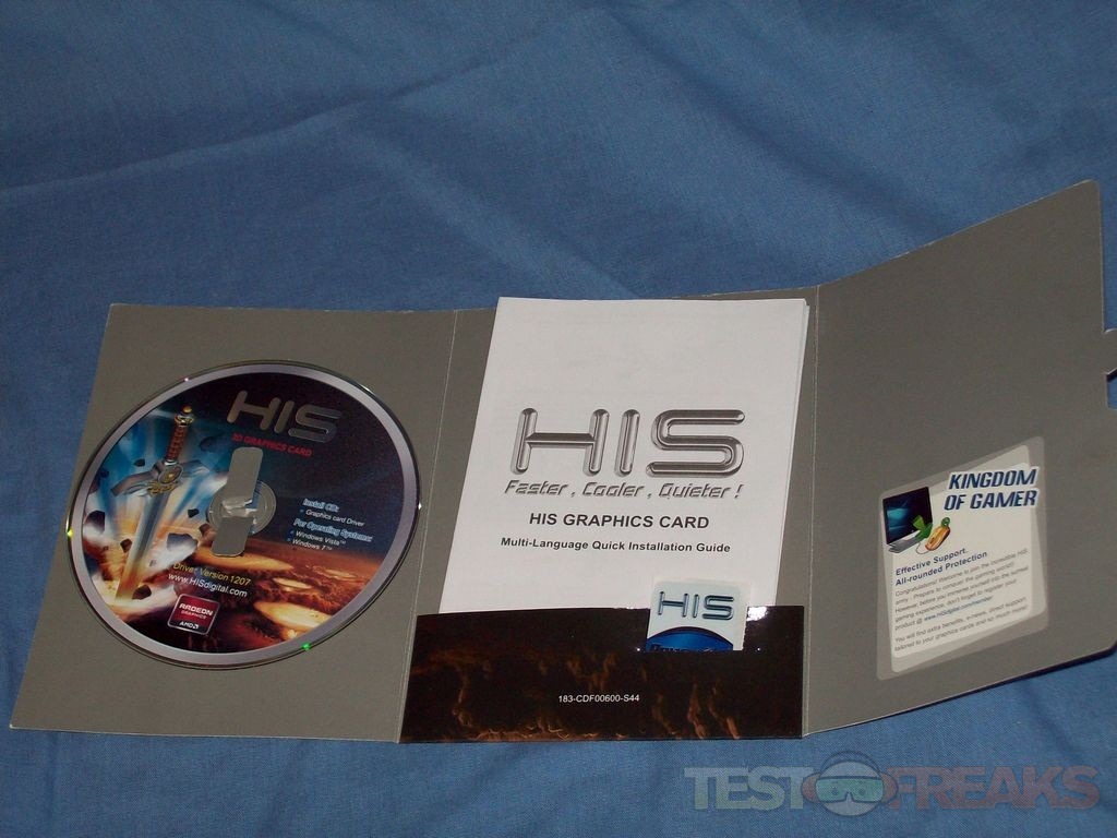 The box for the HIS 7850 is very similar to that of the HIS 7770 that I just reviewed, it’s got the big sword on it with specs and features listed, but it’s a bigger box. Inside you’ll find the same black box with the HIS logo on it. You’ll find the card all snuggled in styrofoam for protection and a basic instruction sheet. Under the styrofoam card section is a removable bottom that has a folder along with a VGA/DVI adapter and a Crossfire bridge and a separate software disc. Here’s everything all placed out for you to see: The folder contains the driver disc and instruction manual. The HIS 7850 card is black and it’s stylish and sleek looking with a clear blue fan in the center of the aluminum heatsink. On the back of the card you’ll find DVI, HDMI and two Displayport connections so you’ve got options in how you want to hook it up. Having all of these connections means more monitors of course. Here’s side views of the card, it has a fast and sleek look to it even on the sides. The Crossfire connection is there too. On the back end of the 7850 is a single PCIE 6pin power connection. I’m surprised that a next gen card only needs a single power connection, but that can be a good thing. Here’s the back of the card or the PCB side, it’s green and rather plain looking: