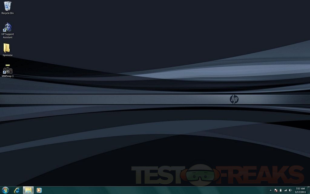When you boot it up the desktop is kind of bare, just the Recycle Bin and HP Support Assistant. I added the MWSnap screen capture software and the folder for my testing.