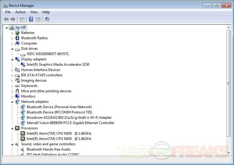 Here’s the Device manager expanded, you cna see it’s got Bluetooth in there are well as 802.11N wireless.
