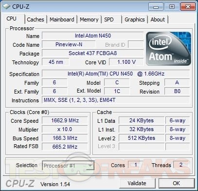 Processor: Intel Atom Processor N450 (1.66 GHz, 512 KB L2 cache, 667 MHz FSB)