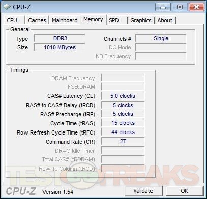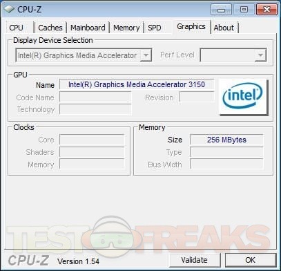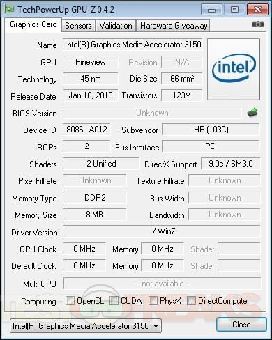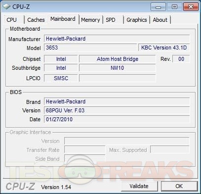 This HP Mini uses the fairly new Intel Atom N450 CPU which runs at 1.66Ghz and we’ve also got the Intel 3150 Graphics Chipset in there as well. For some reason CPU-Z couldn’t read the ram information as you can see the one screen shot is essentially blank, but it comes with 1 gig of DDR3 ram.