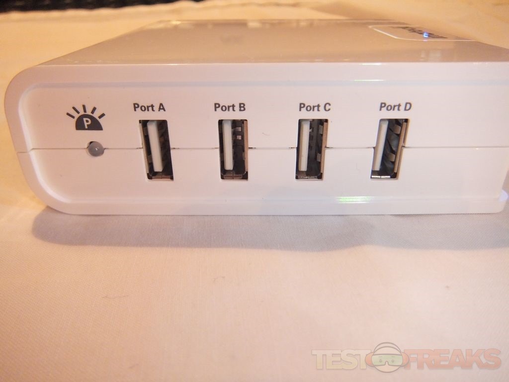 On the front edge you’ll find the power LED and four USB ports labeled A through D.