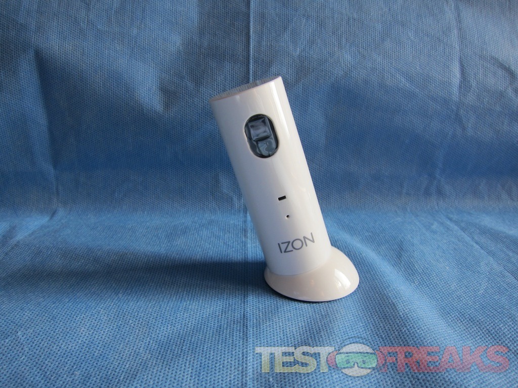 The front of the device has the IZON logo on the bottom, a microphone and LED indicator above it, with the camera on the upper portion.