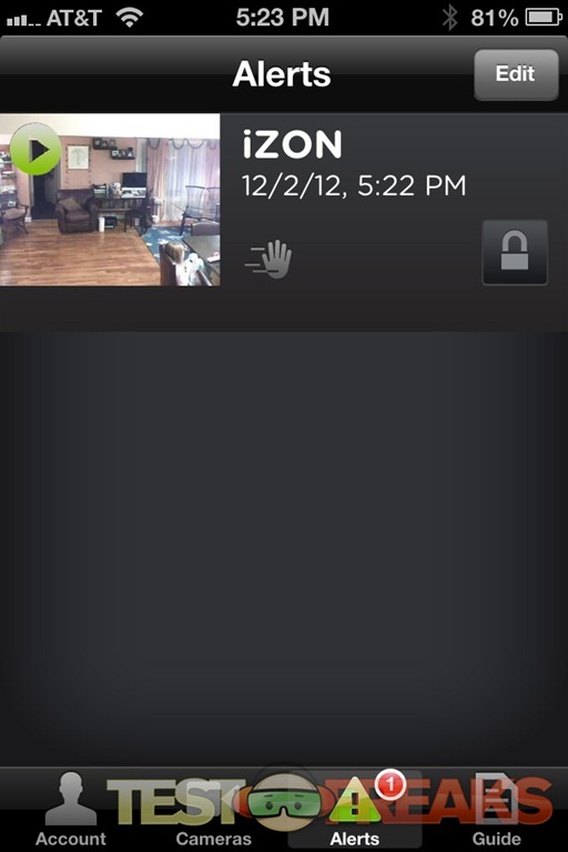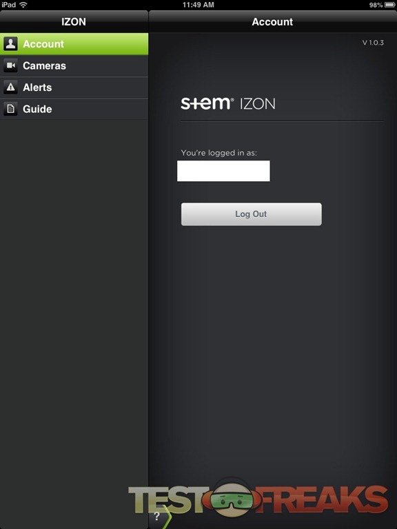 This app features four control settings – Account, Cameras, Alerts and Guide. From these controls you can make adjustments to the system. From the camera tab the user can change settings including alerts and Push notifications as well as recordings 30-second videos.