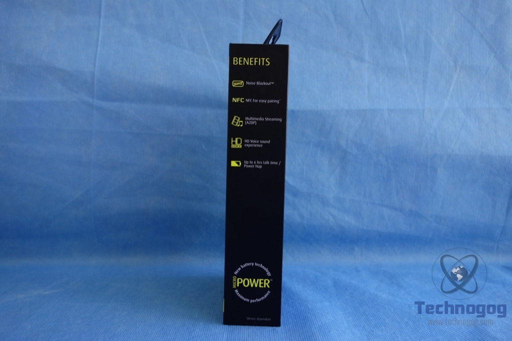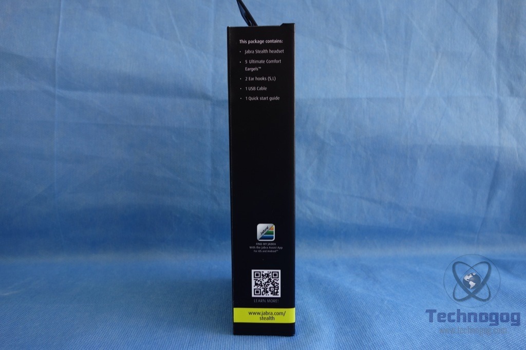 The Jabra Stealth arrives in a black box with an actual size photo of the headset on the front. The Bluetooth logo and Siri/Google Now button are featured also found here. The back of the box explains the MicroPower battery technology. On the side is a list of package contents, QR code and the name of the free Jabra app while the opposite end lists the benefits of the Jabra Stealth.