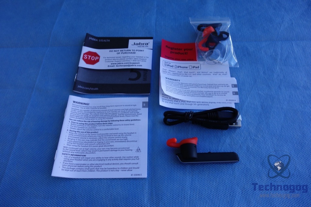 The front cover opens via magnetic closures and inside we see the headset along with an accessory box. Opening the package we find the Jabra Stealth headset, five Ultimate Comfort Eargels, two Ear hooks, a USB cable and Quick Start Guide.