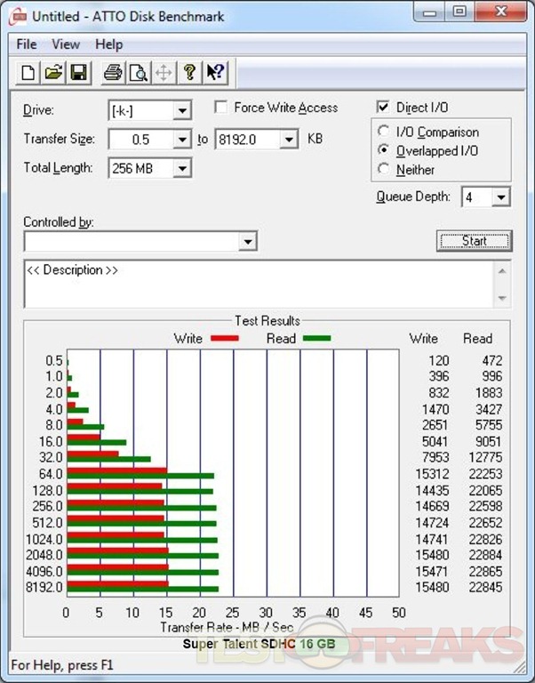 Starting with ATTO using the Kingston USB 3.0 card reader we see the Super Talent with writes around 15 MB/s and reads in the 23 MBs/s range, while our review SDXC is around 14 MB/s for writes and 43 MB/s reads and finally the faster Kingston card has 37 MB/s writes and 63 MB/s for reads.