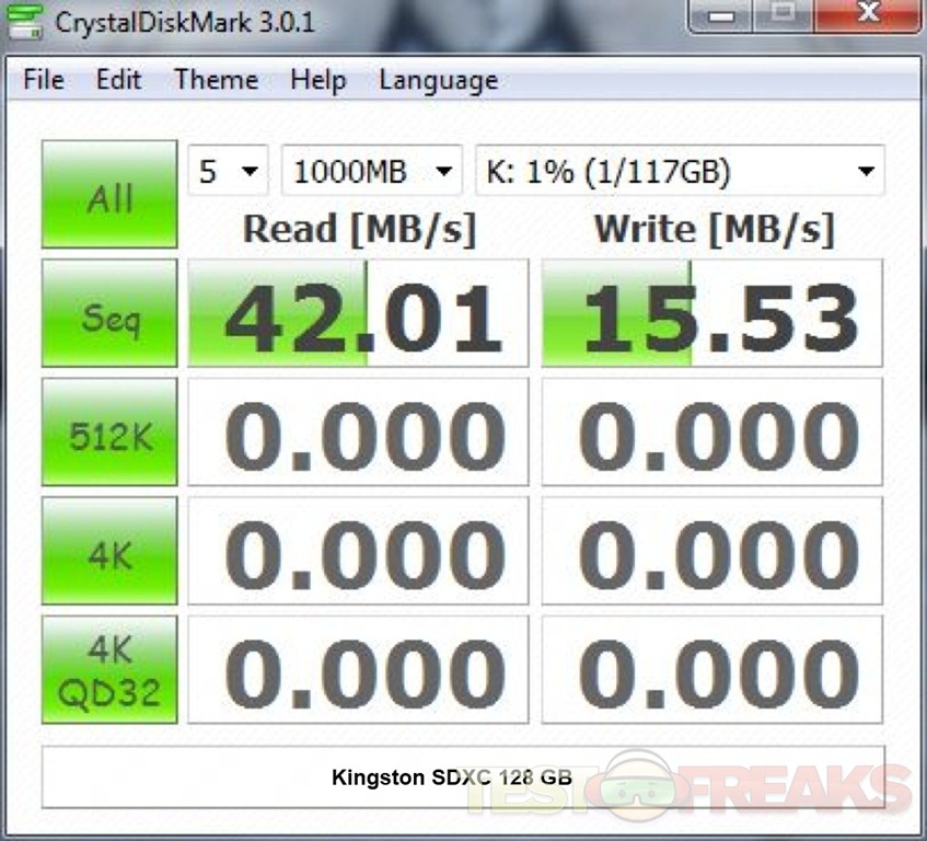 Next we look at Crystal Disk Mark. While the Super Talent SDHC and the Kingston SDXC 128 GB both had equivalent write speeds of 15.53 MB/s, the Kingston won out on read speeds with 42 MB/s vs 23 MB/s. The faster rated Kingston SDXC 64 GB had read speeds of 58.17 MB/s and write speeds of 38.65.