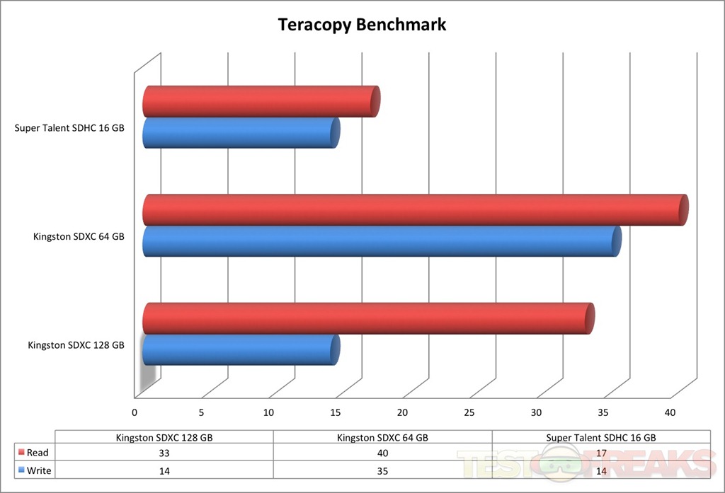 Using Teracopy to transfer a 1 GB file to and from each card yielded the following results. Once again the latest Kingston SDXC had writes on par with the Super Talent SDHC while it was faster in the read speeds. Again, the older Kingston had the fastest read/write speeds.
